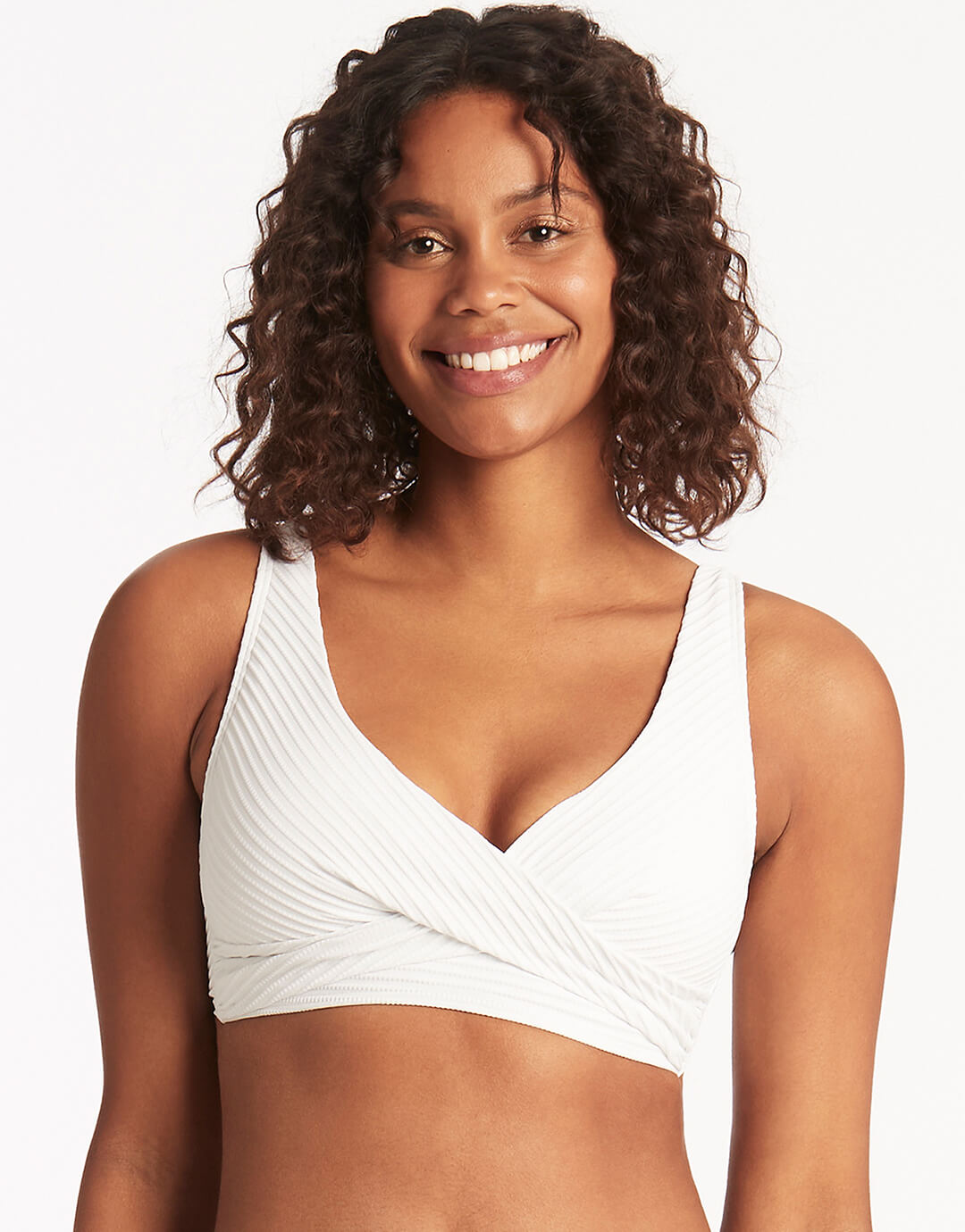 The Spinnaker Cross Front Multi-Fit bikini top from Sea Level Australia is a super textured rib wrap front style in white with comfortable wide straps. Inside there is side boning and power mesh for great shape and support and an E-hook back fitting and adjustable and convertible straps to ensure the best fit.