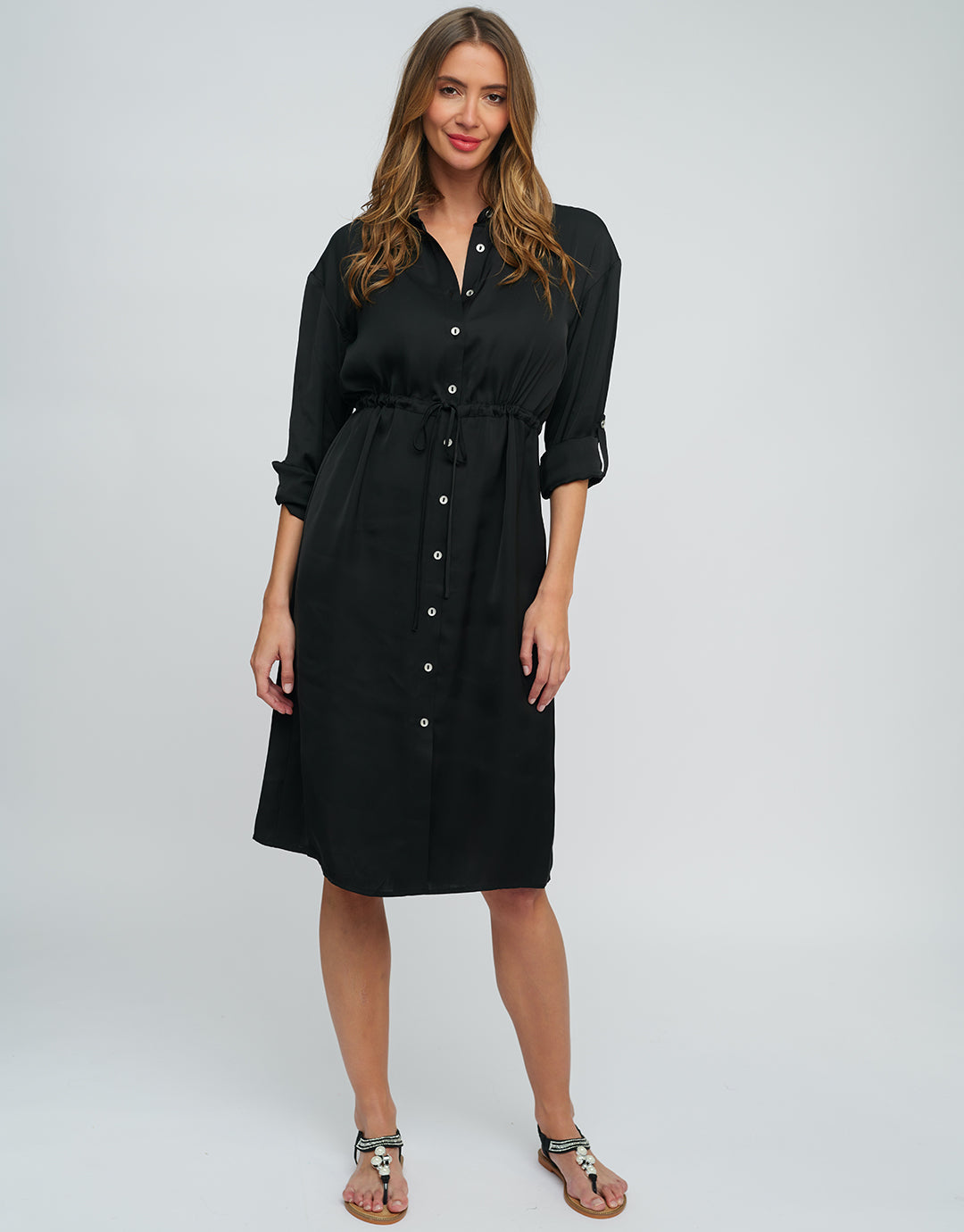 The Alora Shirt Dress from Pia Rossini is a great knee-length shirt dress with a collar, long sleeves with tabs to hold when rolled up, a button-through front and a waist tie to cinch.
