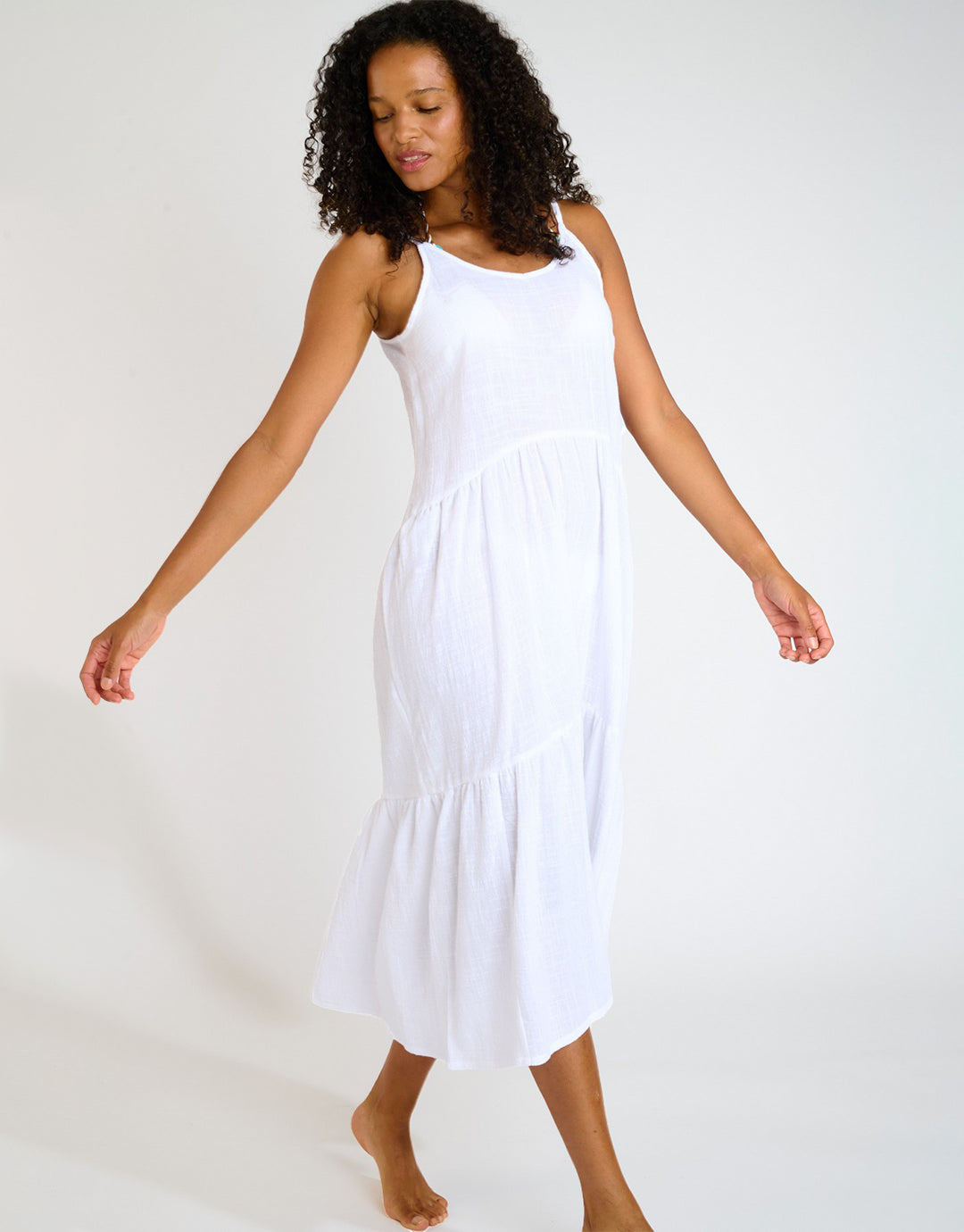The Cameron Laguna Maxi dress from Banana Moon is a midi length dress with a V neck and scoop back, in a soft white cotton. With thin straps and a tiered style that hangs in delicate pleats from the waist.