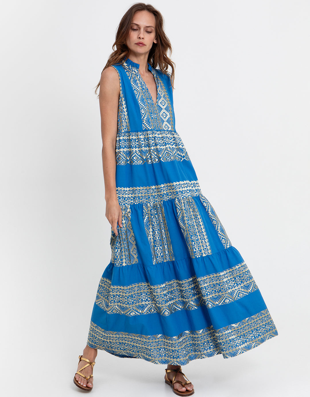 The Classic Triangle Sleeveless Maxi dress from Greek Archaic Kori is crafted from breathable cotton featuring intricate, triangle shaped, champagne coloured embroidery. A flattering V-neckline transitions into a tiered skirt that finishes just at the ankle for a chic silhouette.