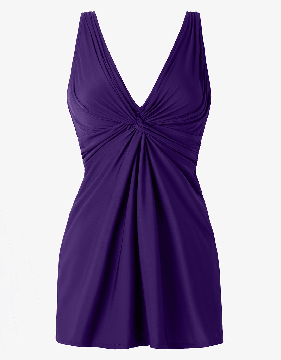 The Must Haves Marais swim dress from Miraclesuit is a super style when you want a little more coverage. This Must Haves version in Mulberry is an easy-fit style with a plunge front, a twist detail at the bust and a short gathered skirt which finishes just below the knicker line.