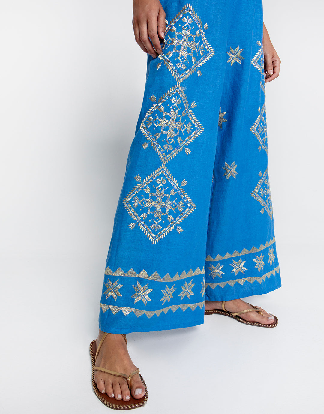 The Lefkada trousers from Greek Archaic Kori are beautiful blue linen trousers decorated with gold metallic embroidery, in a wide, floaty leg with an elasticated waist.
