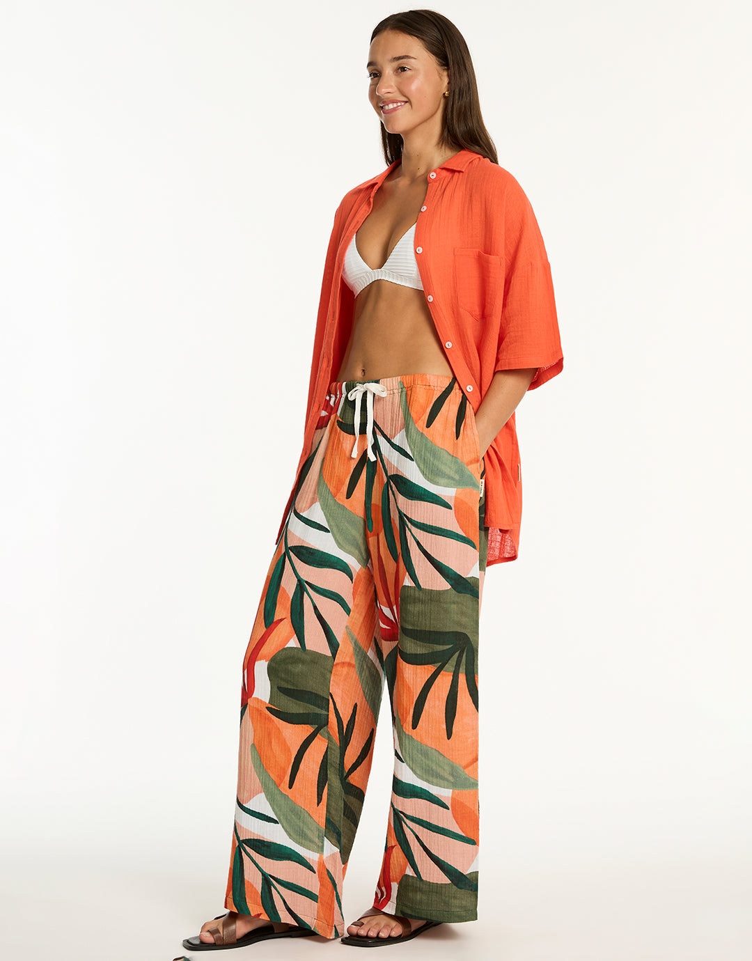 The Tropaluxe Surf pant by Sea Level in a tropical botanical print of sunbaked orange and khaki colours, these wide-leg beach trousers offer a relaxed fit enhanced by an elasticated waist and adjustable drawstring cord. Practical side pockets add convenience, making them ideal for beach days.