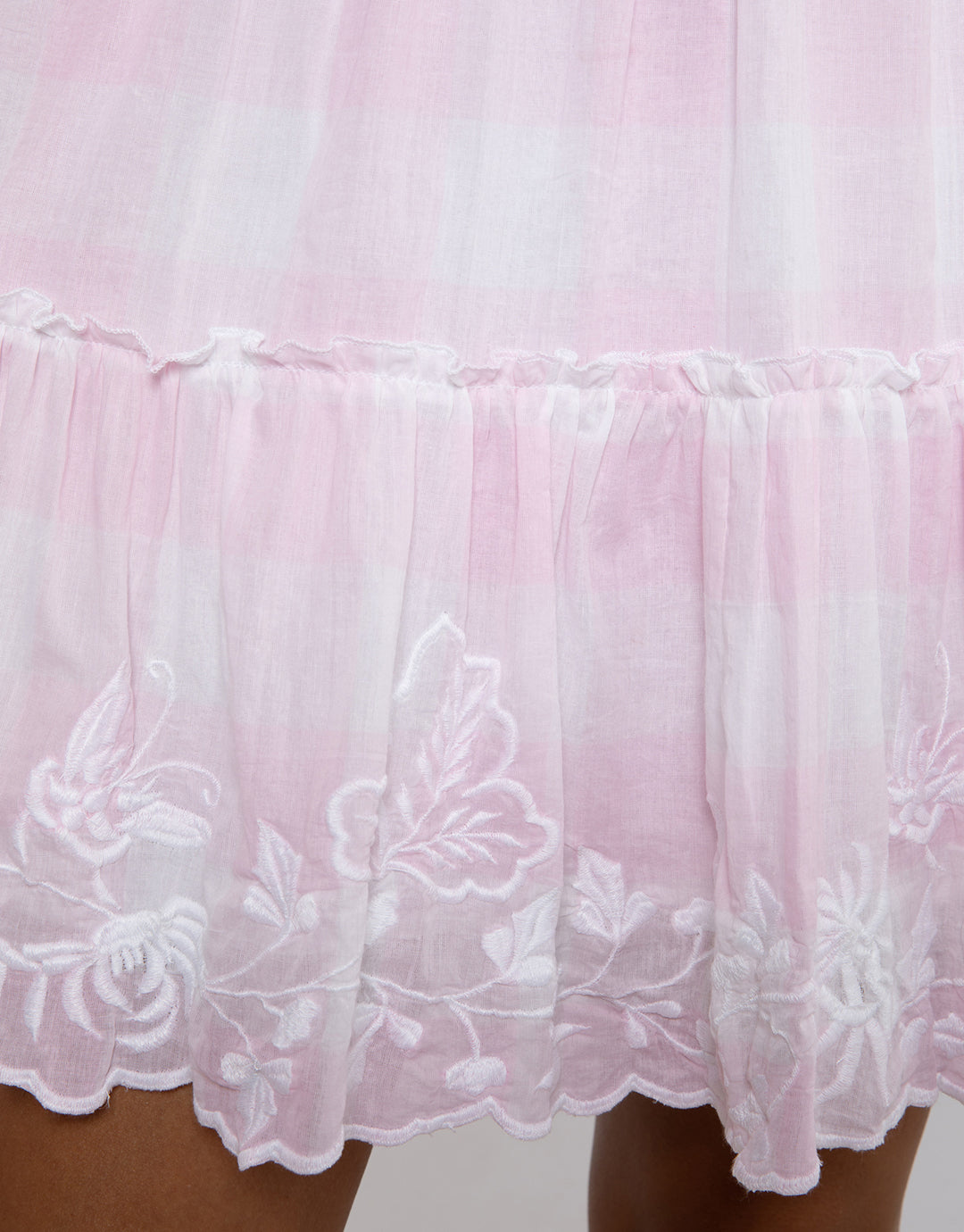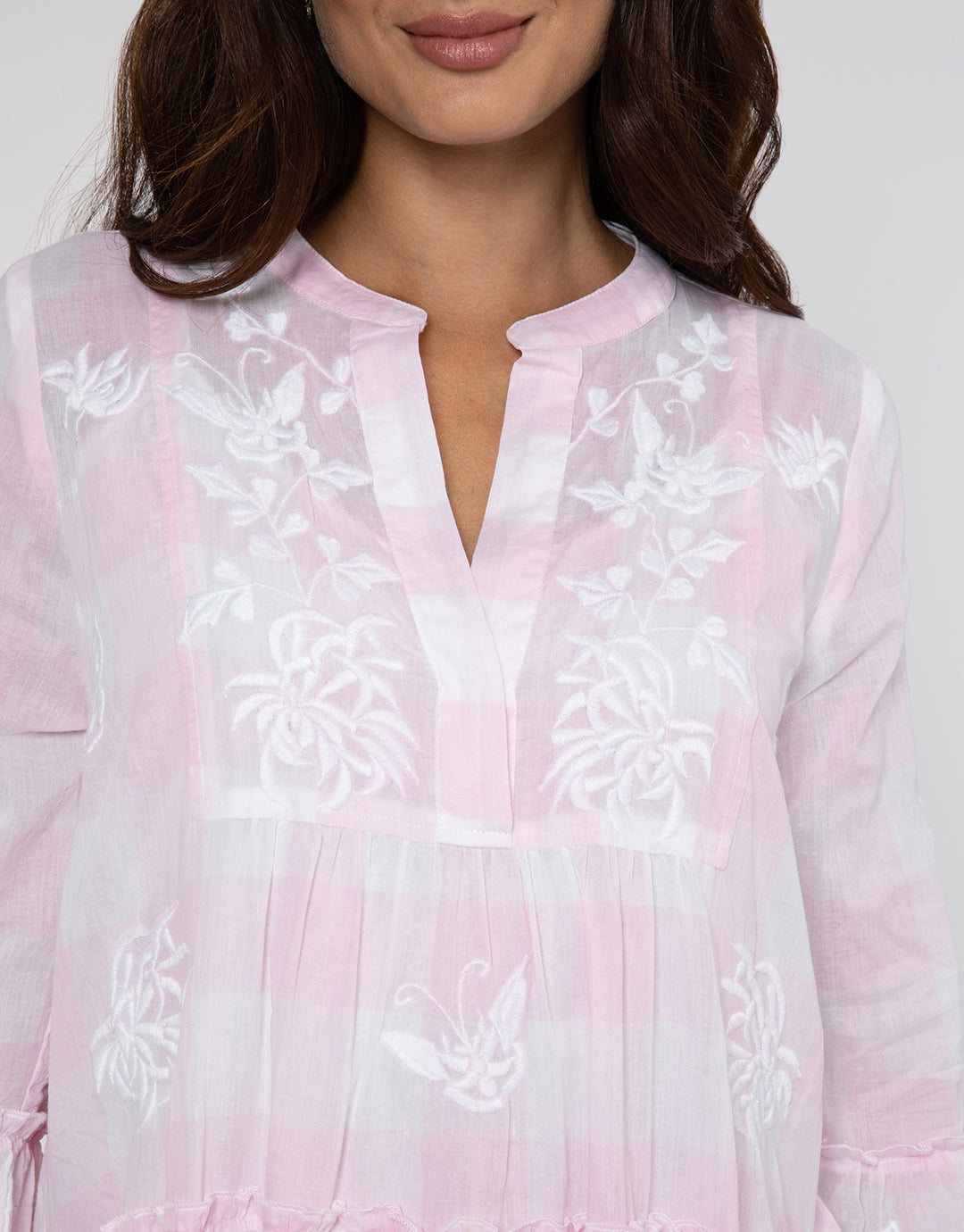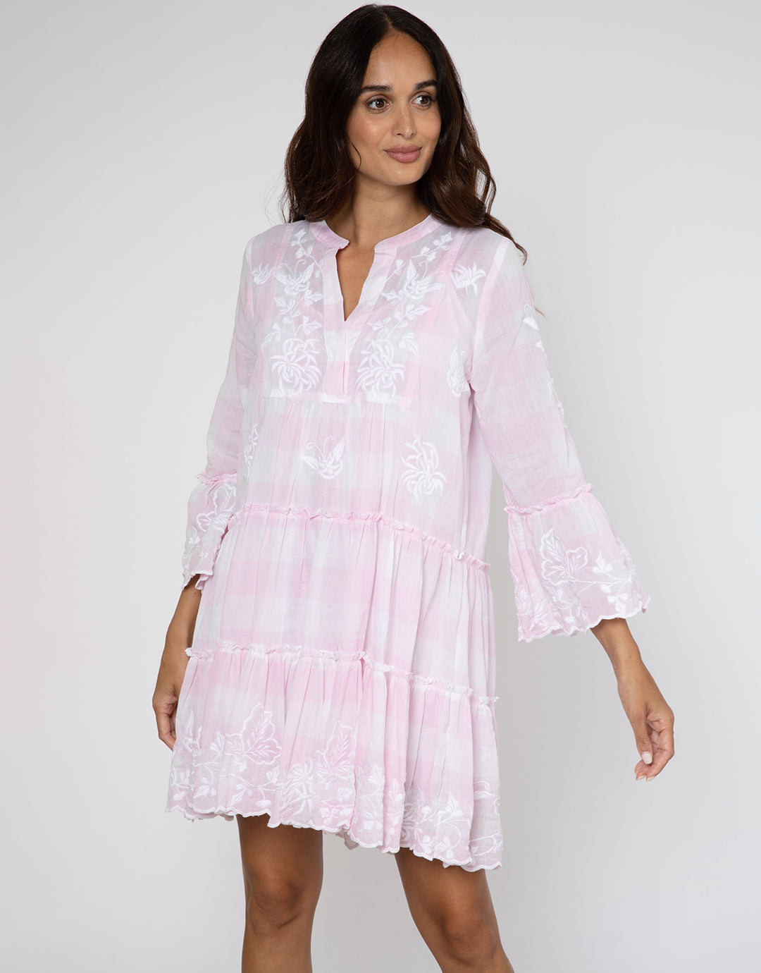 The Butterfly Gingham Flared Sleeve dress from Juliet Dunn is a lovely pale pink gingham with white floral butterfly embroidery. In a loose fit, just-above-the-knee length style that is slightly longer at the back, a tiered skirt, flared sleeves and a slashed V neck.