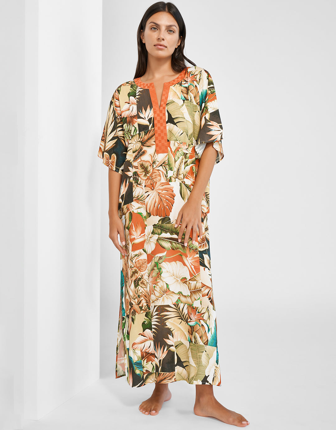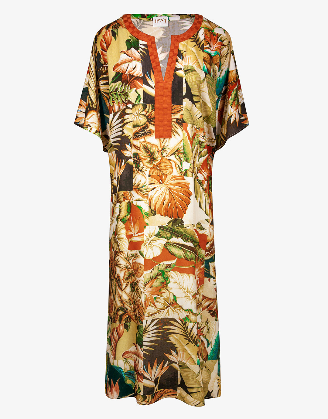 The Hypnotic Maxi kaftan from Maryan Mehlhorn is a relaxed and airy caftan with v-shaped neckline, slit up the right side and elbow length, cornet sleeves. The abstract, large tropical leaf print in sunbaked browns and greens is framed by an embroidered, chequered facing along the neckline.