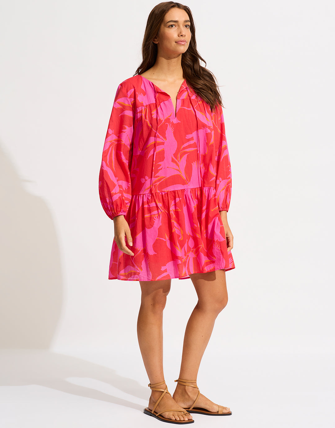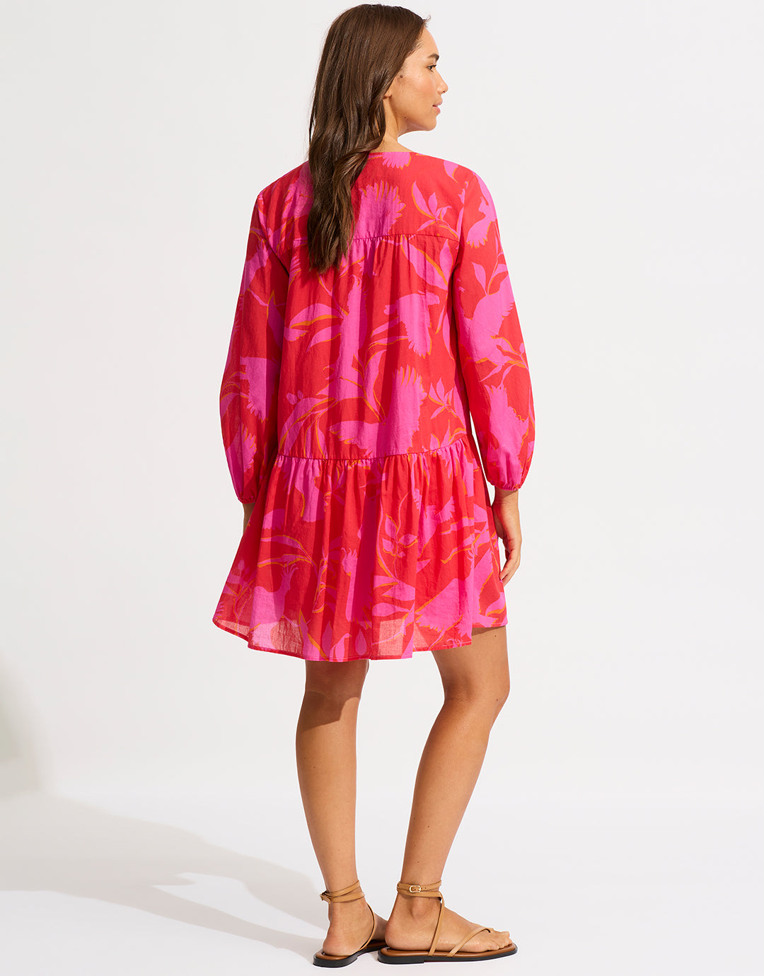 The beautiful Birds of Paradise Cover Up from Seafolly is a lovely red and pink print mini dress with a drop waist, gathered skirt and long sleeves gathered at the cuffs.