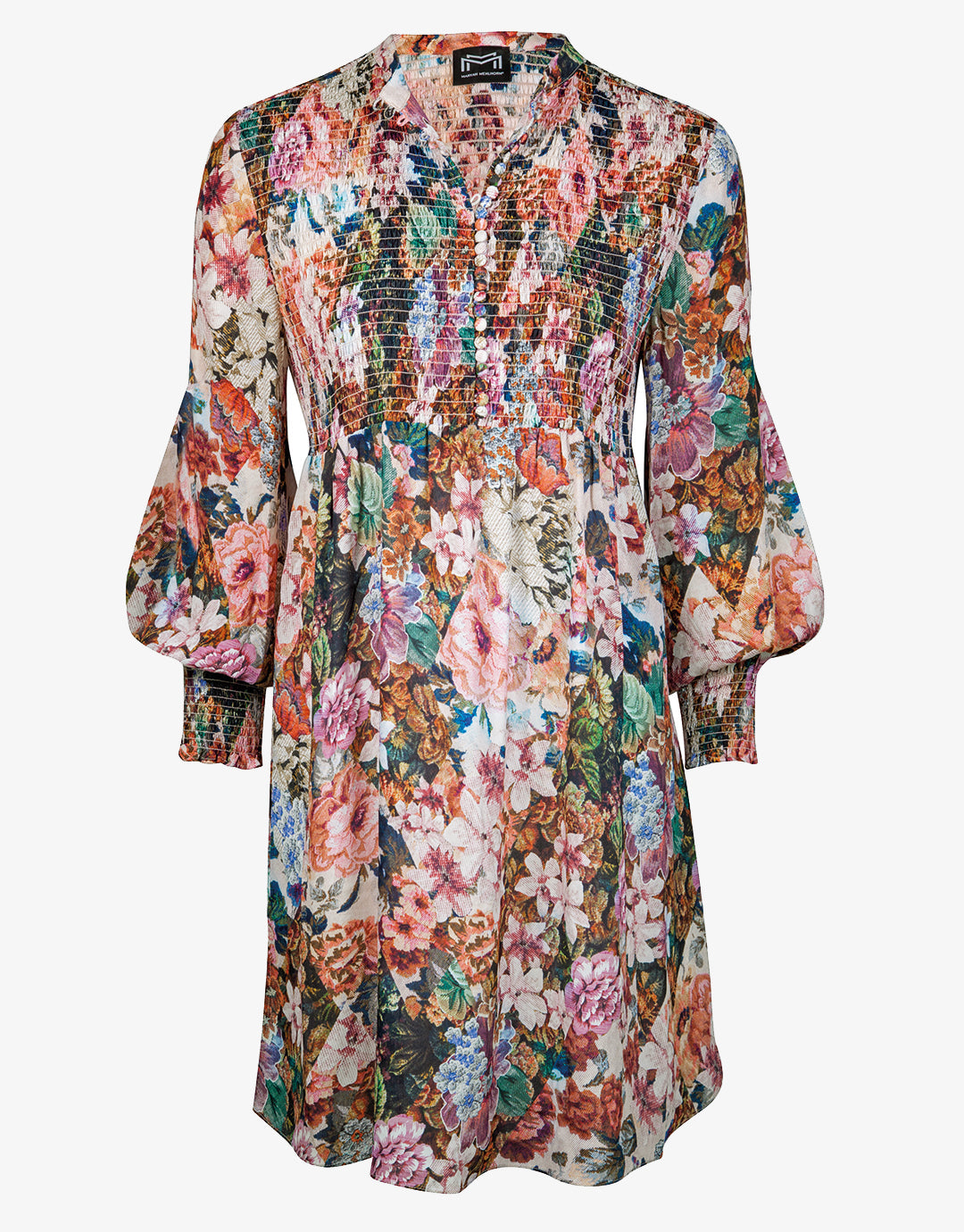 The Opulence Tunic from Maryan Mehlhorn is a beautiful blouse style tunic in antique furnishing style floral interwoven with geometric pattern. Mini length and with long balloon sleeves gathered at the cuffs with pintuck detailing. The front is buttoned to the waist and features matching pintucks across the front.