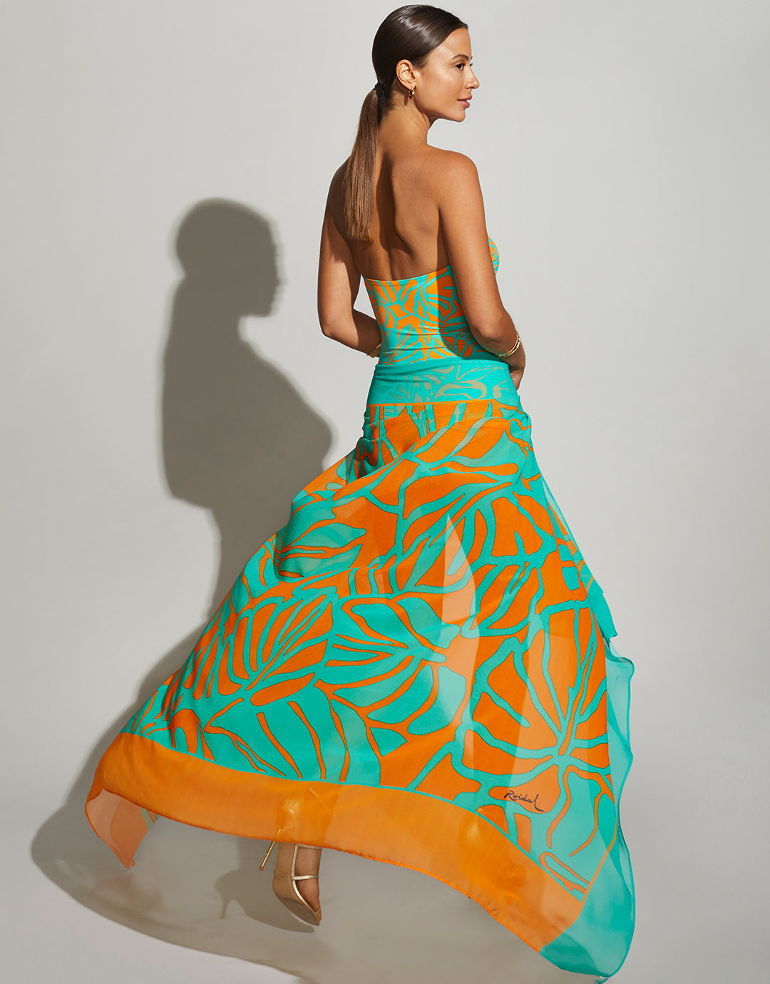 The Palma pareo from Roidal is a beautiful sarong in a vivid, maxi palm leaf print of green and orange with a green border on one side and orange on the other, perfect for multiway wear.