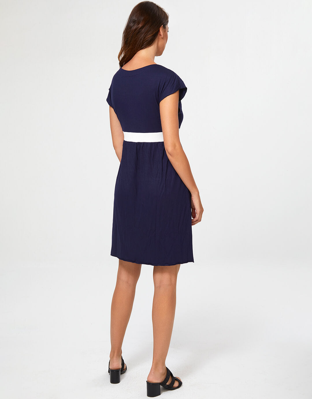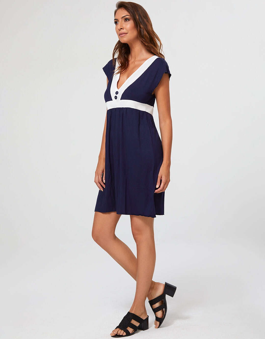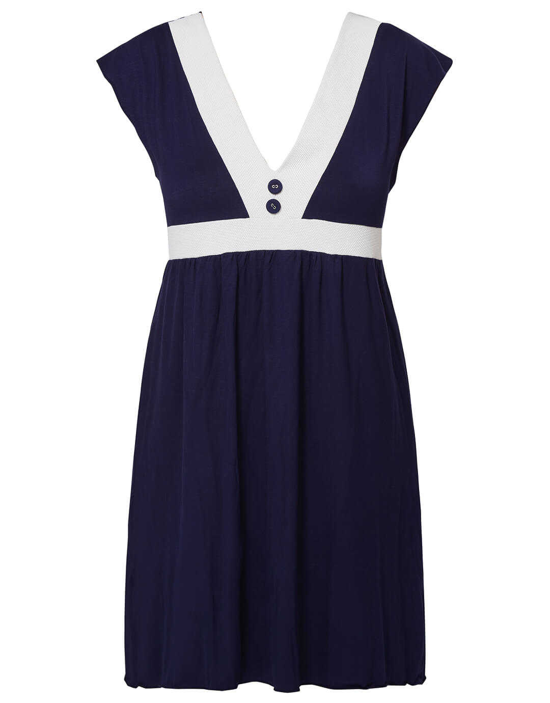 The Pitusa dress from Nuria Ferrer is a great summer mini dress in navy and white with V neck, a slightly gathered skirt and button detailing.