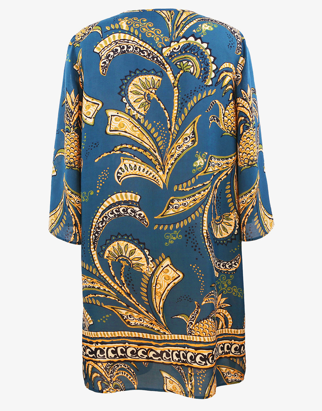 The Satin Fruits Tunic from Charmline is a beautiful teal and gold look pineapple print tunic with a round neck and three-quarter length sleeves.