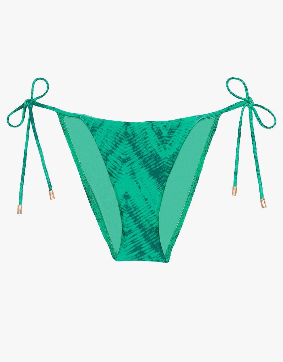 The Tamale Jaque Tie Side bikini pant from ViX is a gorgeous green print tie-side bikini pant in full cut with gold-coated bead detailing on the ties