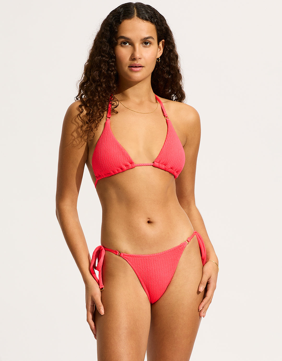 The Sea Dive Tie Side Rio bikini pant from Seafolly is made from lovely knitted stretch fabric with a beautiful textural wave lifting plain coloured styles with lustre and a three-dimensional effect. This little pant style has minimal rear coverage and ties at the sides.