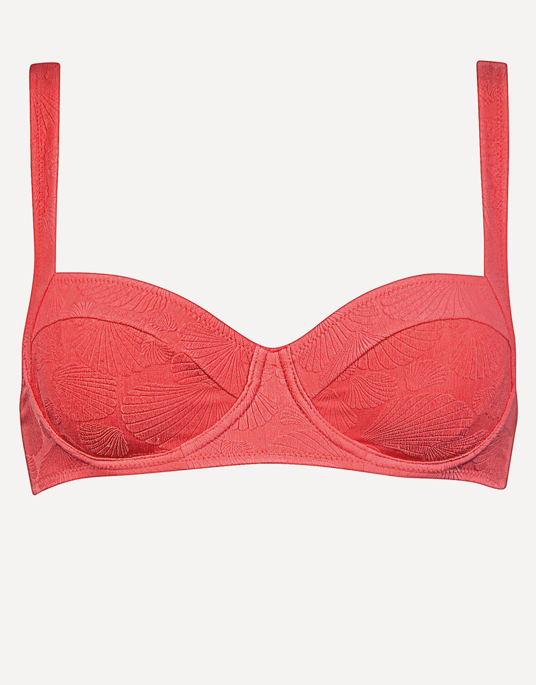 The Coastal Daydream Balconette bikini top from Watercult in bright coral red is a lovely balconette style with underwired cups and adjustable straps for great support.