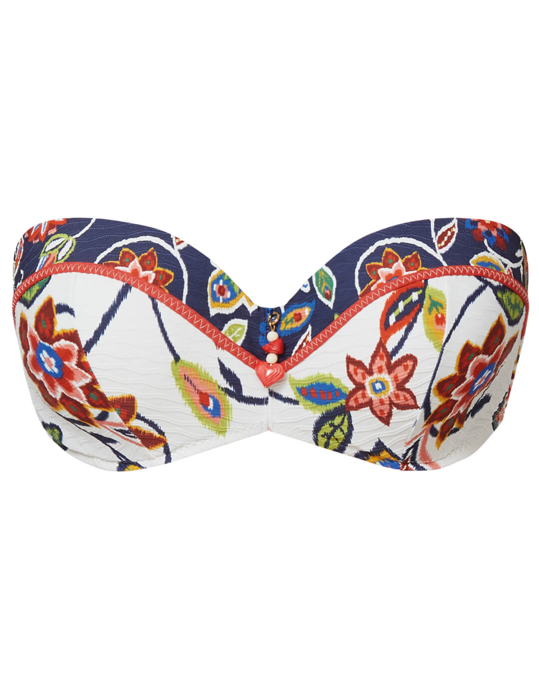 The Dana Bandeau bikini top from Nuria Ferrer is a pretty white and navy tapestry style print. This shaped bandeau style has underwire and moulded cups, a clip at the back and optional adjustable straps.