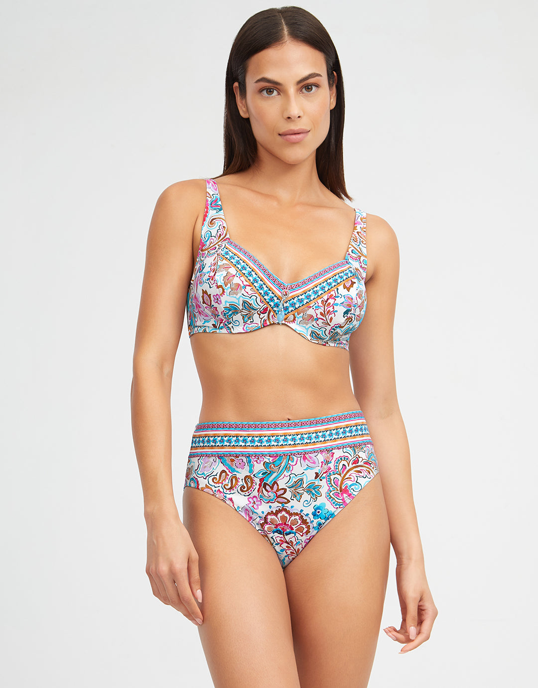 The Laia Underwired bikini top from Nuria Ferrer, in a vibrant multicoloured paisley print, is elegantly framed by a turquoise blue border along the neckline. Designed for both style and support, this bikini top features wide, adjustable straps and underwired cups for a secure and flattering fit.