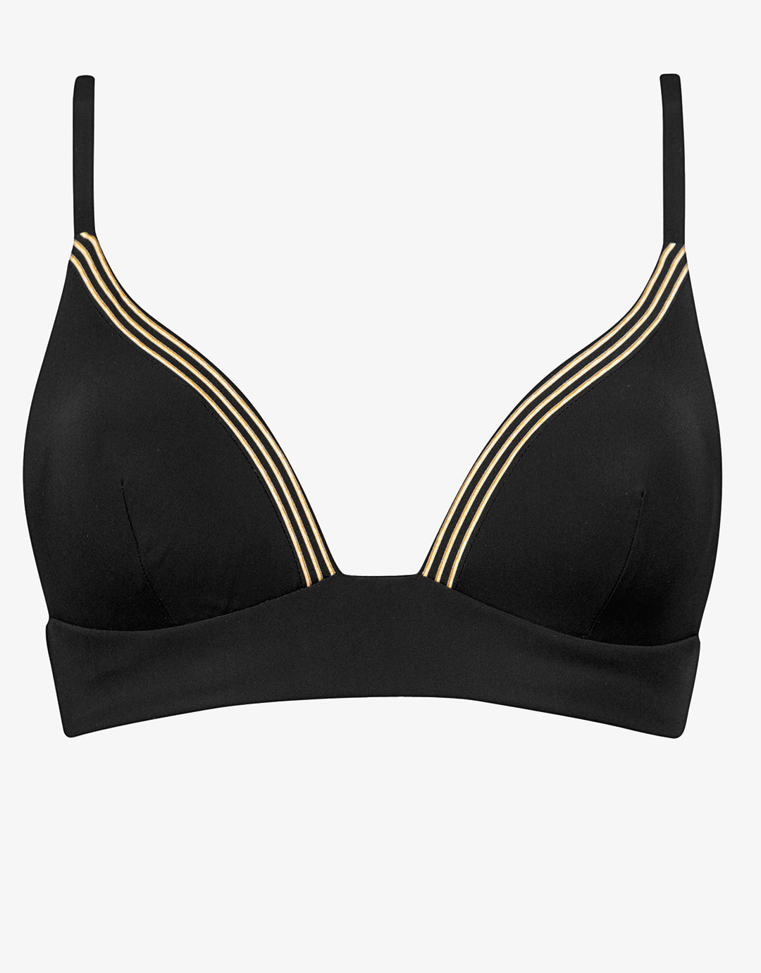 The Stratum Bralette bikini top from Maryan Mehlhorn in understated black with gold stripes framing the neckline is a pretty bralette style with a wide under-band, moulded cups and narrow, adjustable straps.