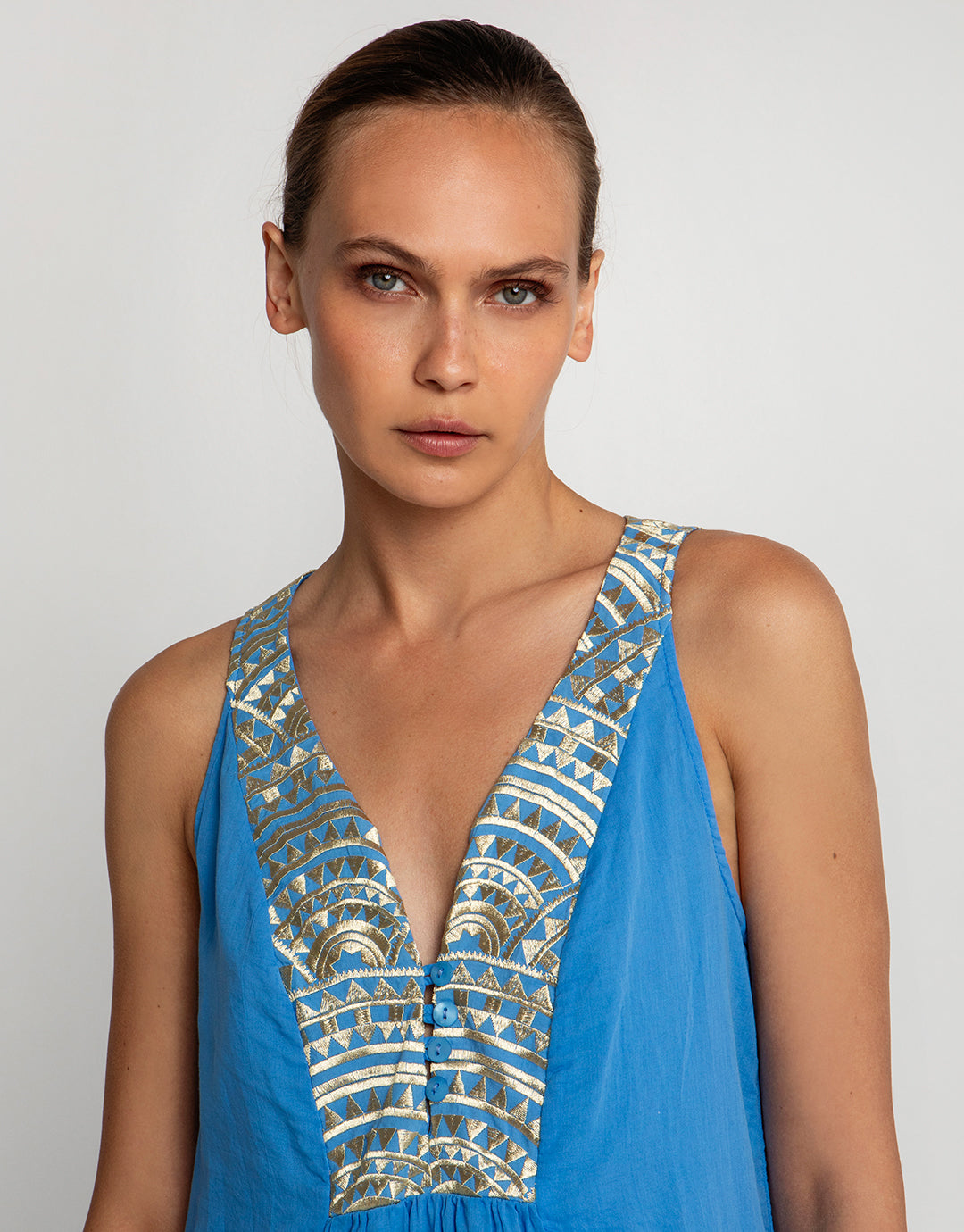 The New Triangle Maxi dress from Greek Archaic Kori is a lovely sleeveless cotton dress featuring a plunging neckline and buttons under the bust, adorned with intricate champagne embroidery that embellishes the neckline. The back showcases a striking panel of triangle embroidery, while subtle gathering at the front and back creates a relaxed, flowing silhouette.