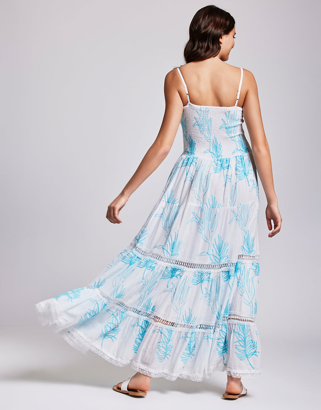 The Joy Strappy Maxi dress from Iconique features a turquoise coral print on a white background. The embroidered and shirred bust is balanced by a multi-tiered skirt.
