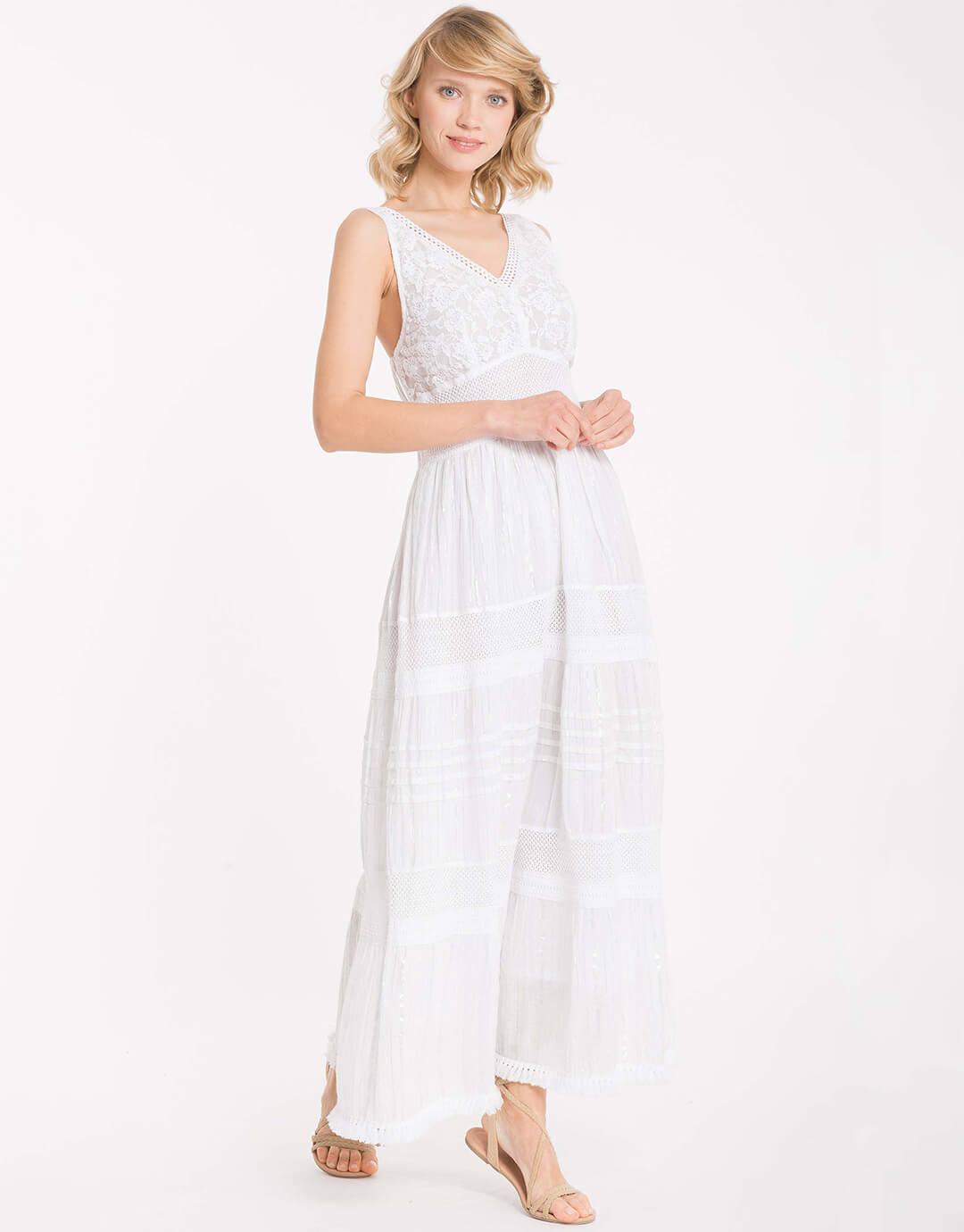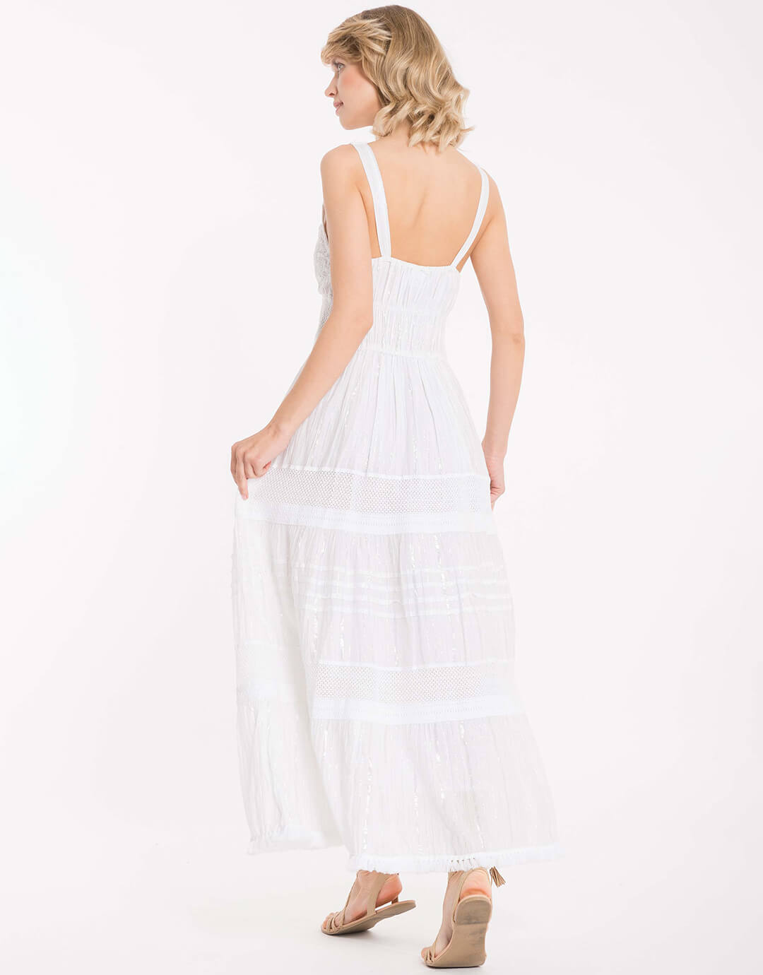 The Lia Maxi Dress from Iconique is a maxi-length dress with medium-wide straps and a V neck. The white cotton fabric is adorned with lace detail panels and the back of the bodice is smocked to offer a versatile fit.