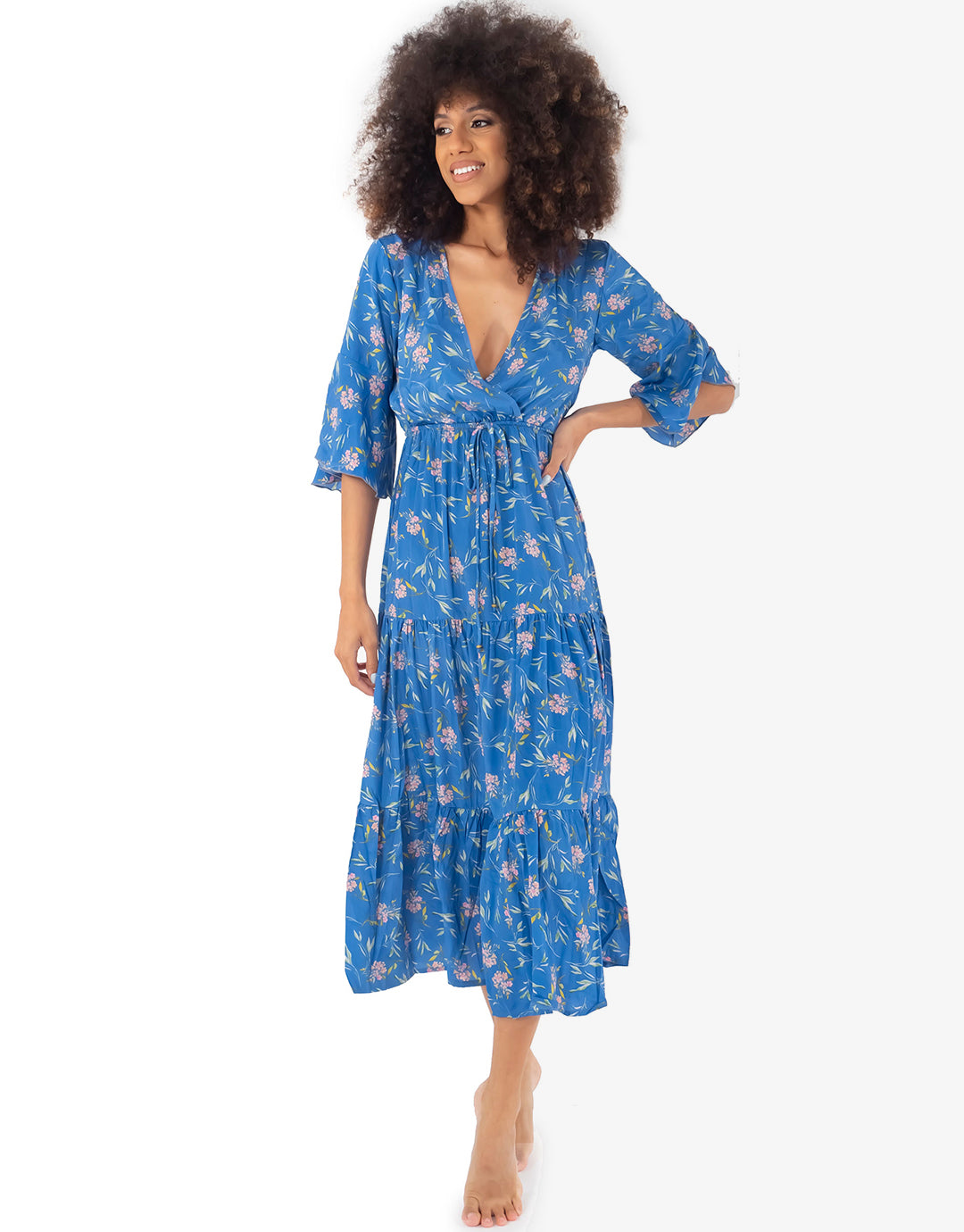 For a bohemian inspired look, choose the Maya maxi dress by Iconique. Boasting a romantic floral print on a sky blue background, this dress comes with three quarter sleeves a deep v neckline and a tiered maxi skirt.