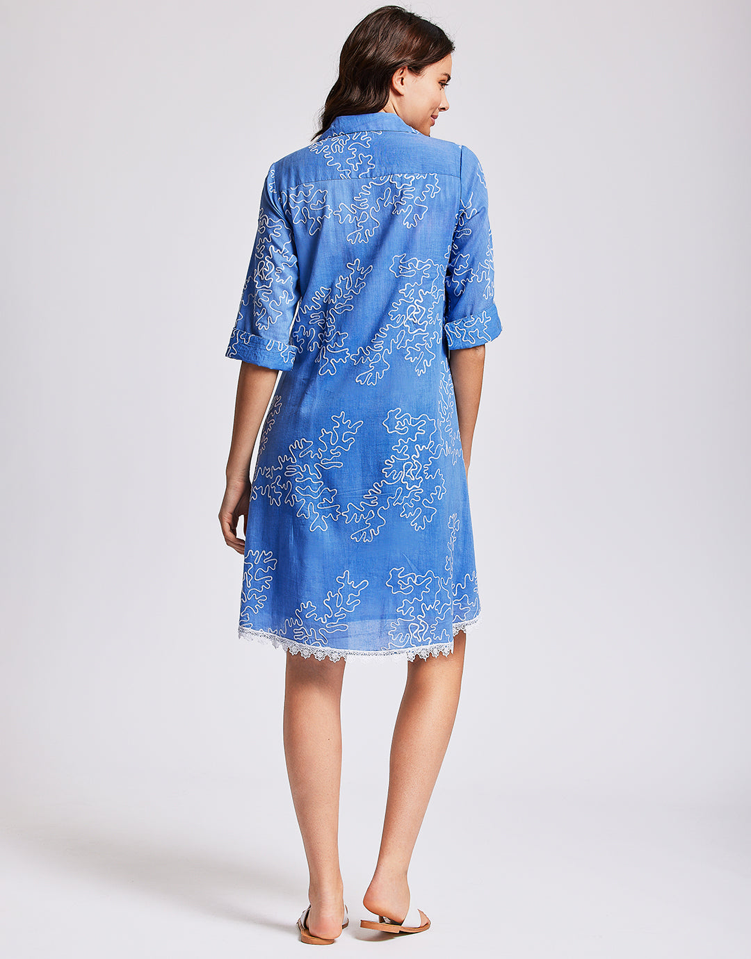 The Romina 3/4 Sleeve Shirt dress from Iconique features embroidery throughout, a traditional collar, a buttoned front and side slits for an elegant beach look.