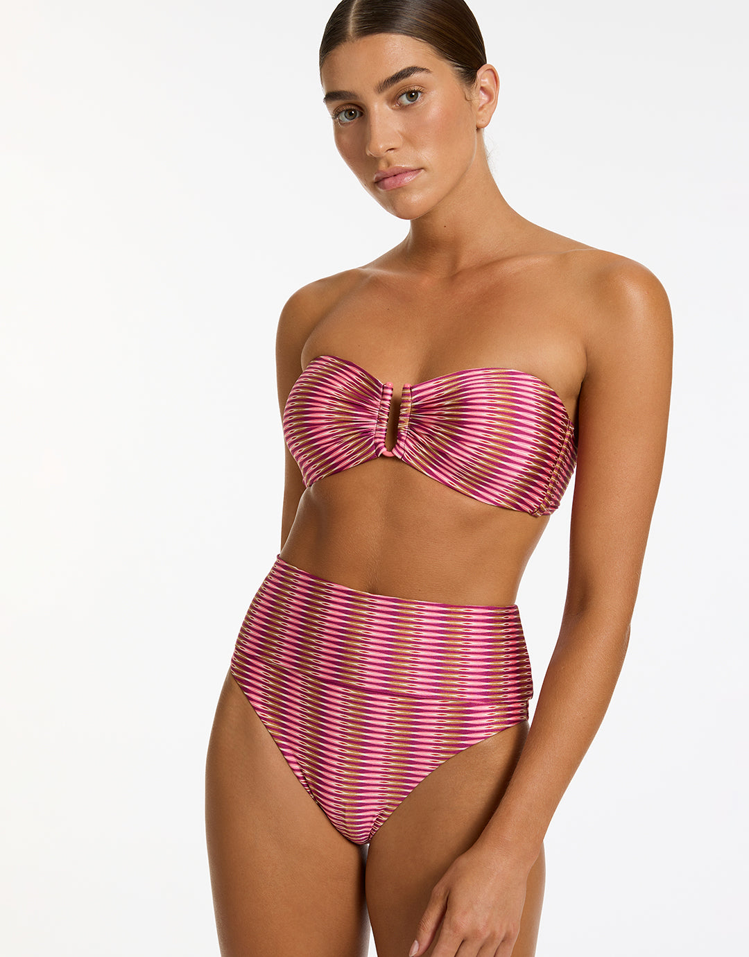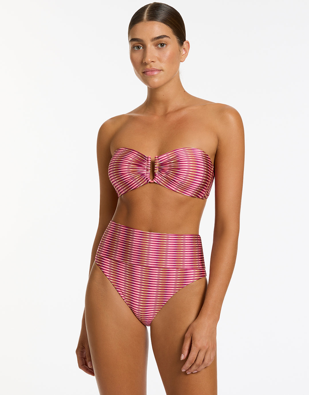 The Alessia Geo Fold Down bikini pant from Jets in a Peony pink geometric print is an adjustable coverage pant allowing you to vary the height of the pant thanks to a deep folded waistband. This combined with the regular cut leg offers full rear coverage.