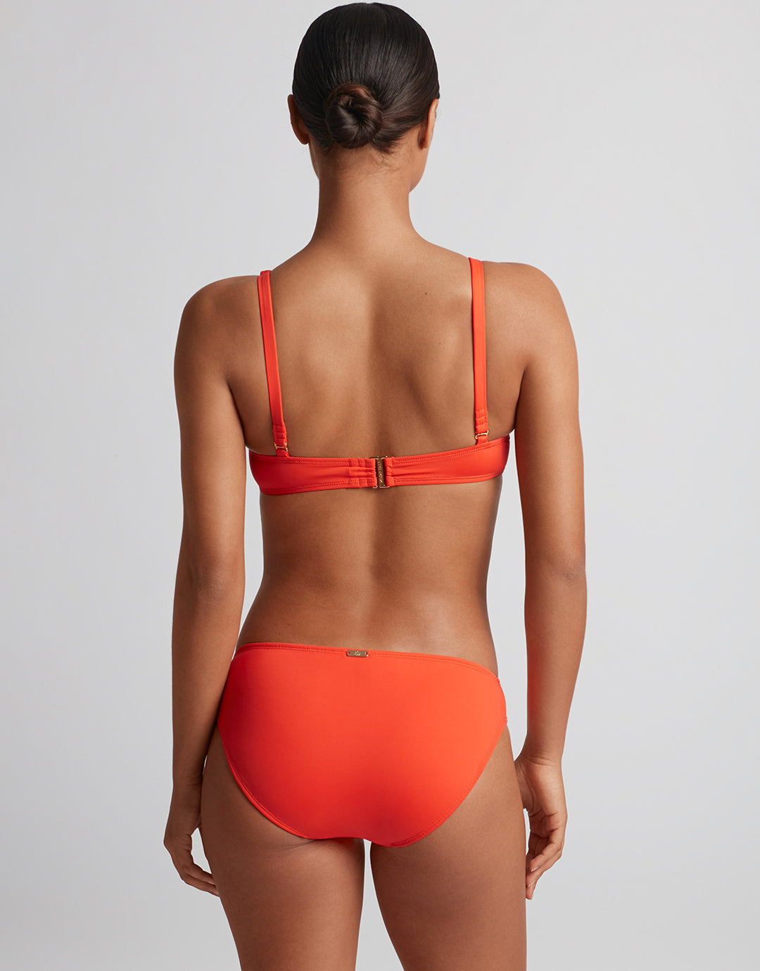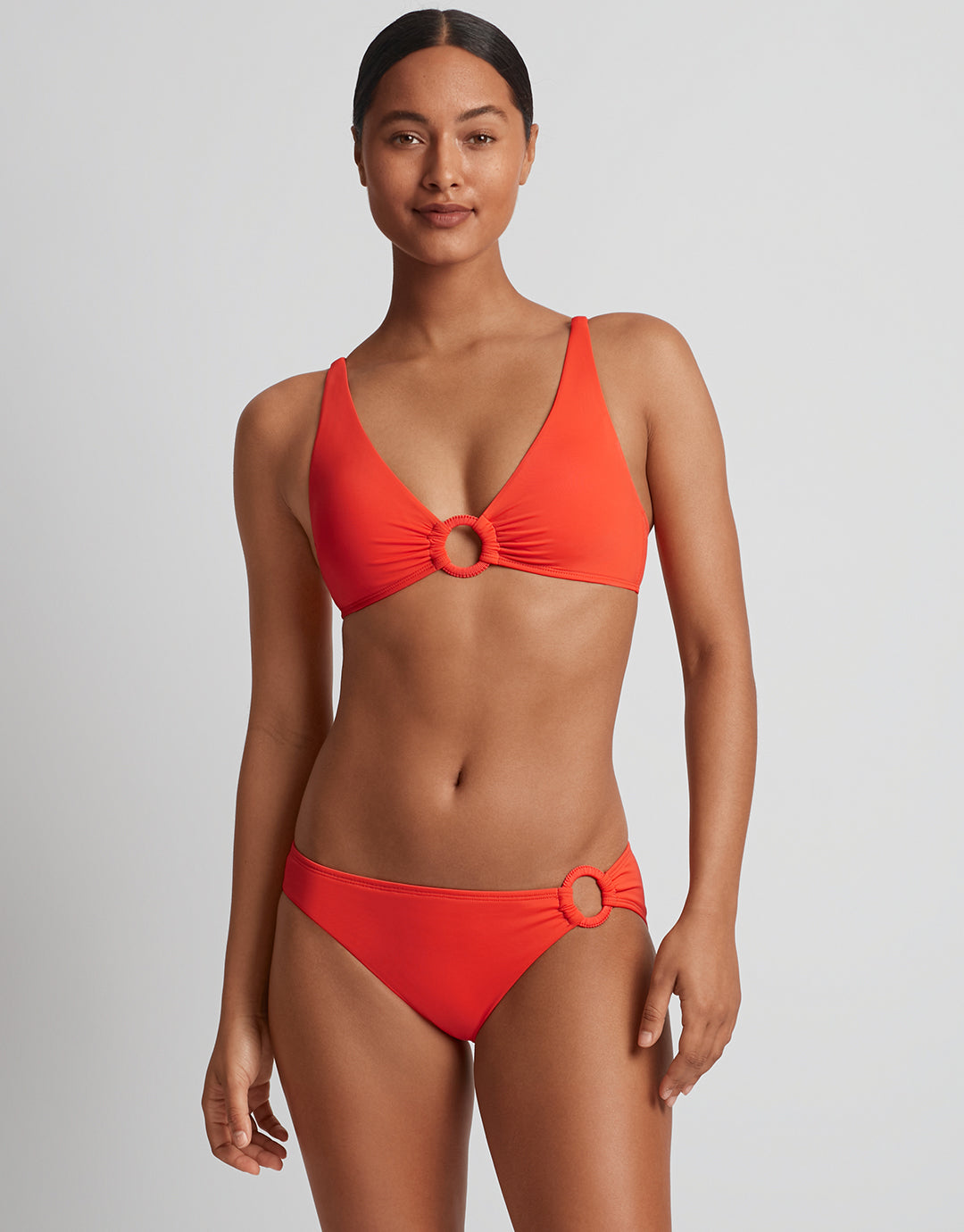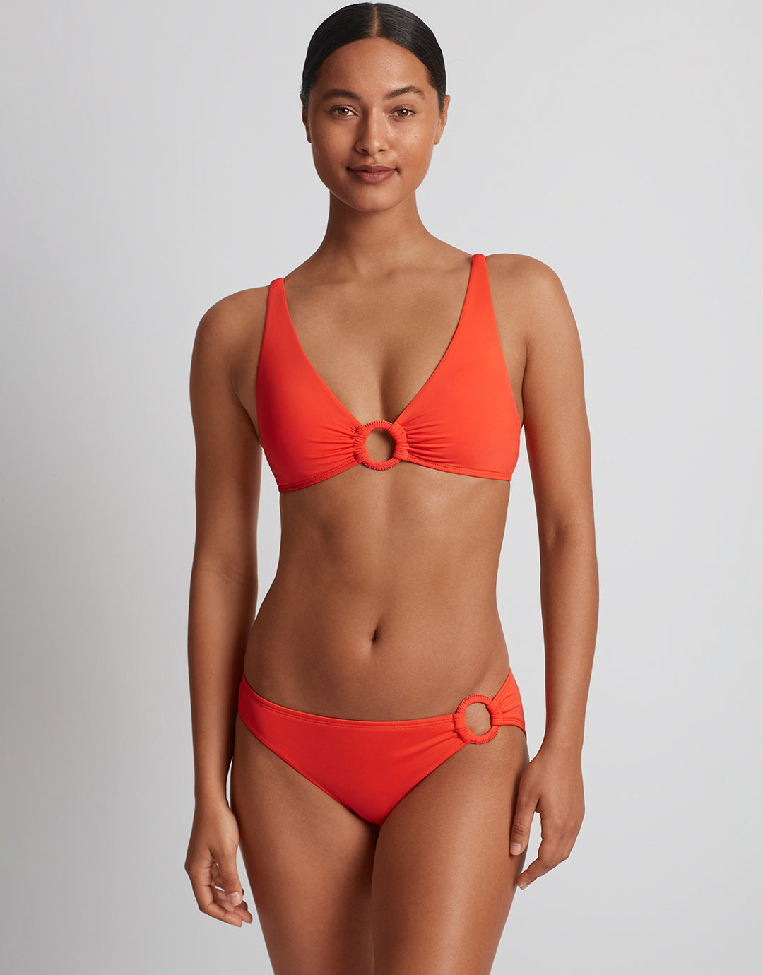 The Beach Club Solids Macrame Ring OTS bikini top from Lauren Ralph Lauren in vibrant Persimmon red is a lovely style with a plunging neckline leading to a fabric covered ring detail between removable, padded cups.