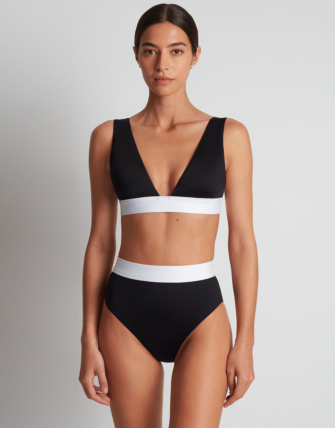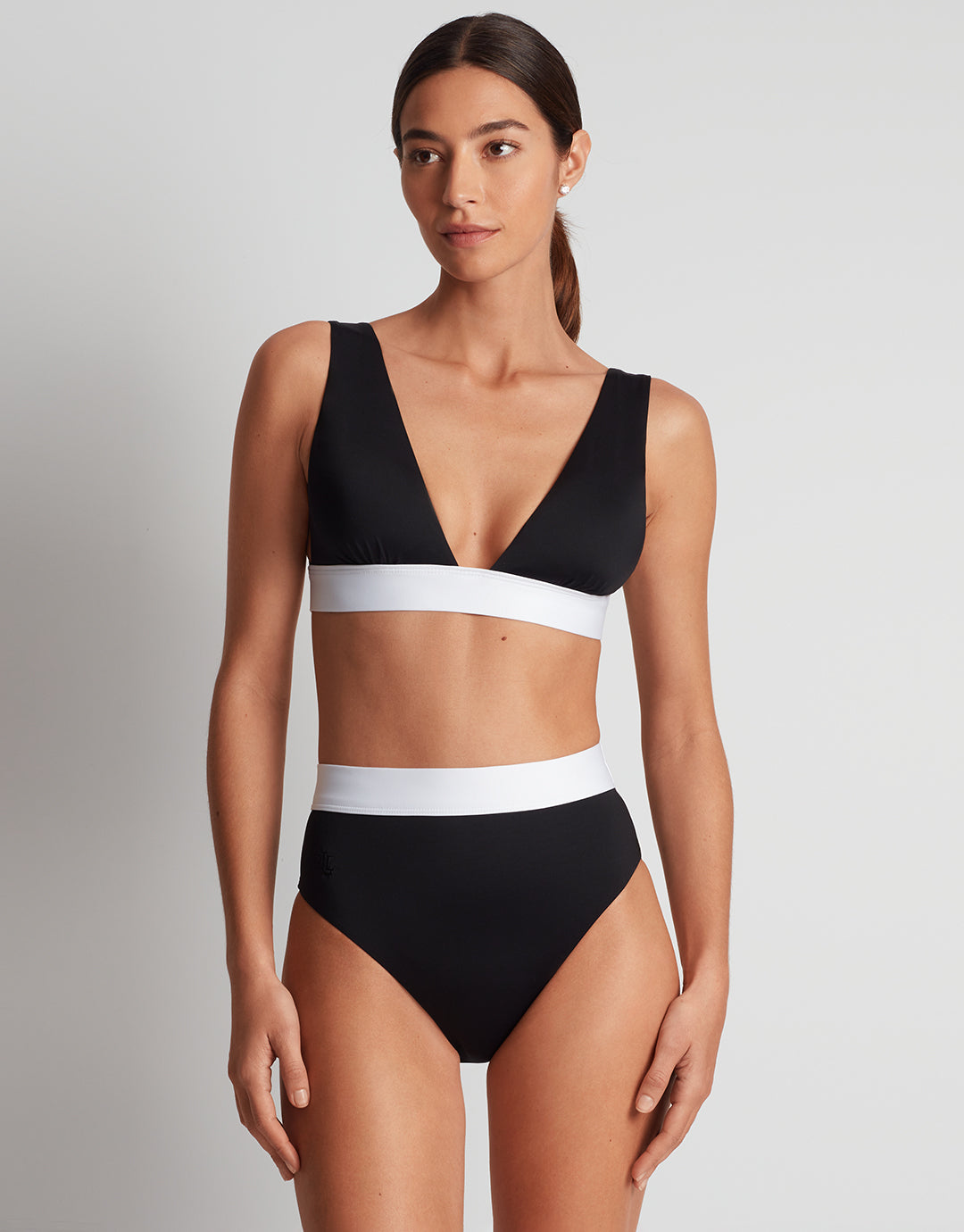 The Bel Air High Waist bikini pant from Lauren by Ralph Lauren in classic black with a white band around the waist, is a high waist style with a medium leg offering moderate coverage. Featuring shaping elastane for a flattering silhouette.