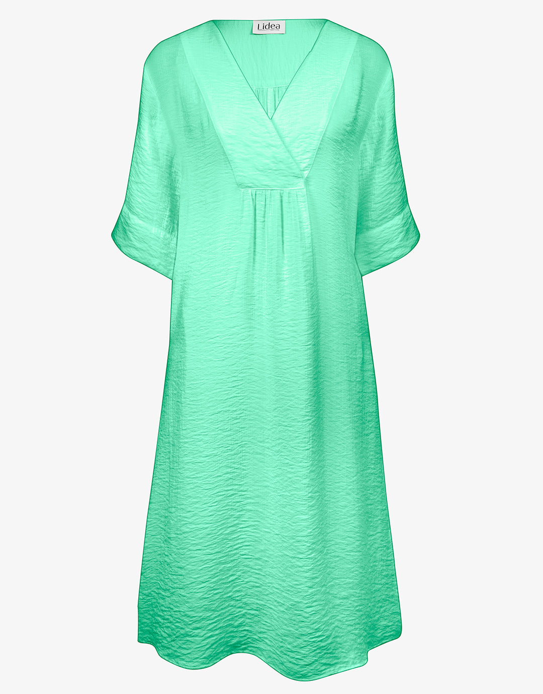 The Lidea beach dress in a beautiful pastel mint green is a knee length cover up with three quarter length sleeves, a v shaped neckline and flattering pleating under the bust and on the back creating a flattering drape.