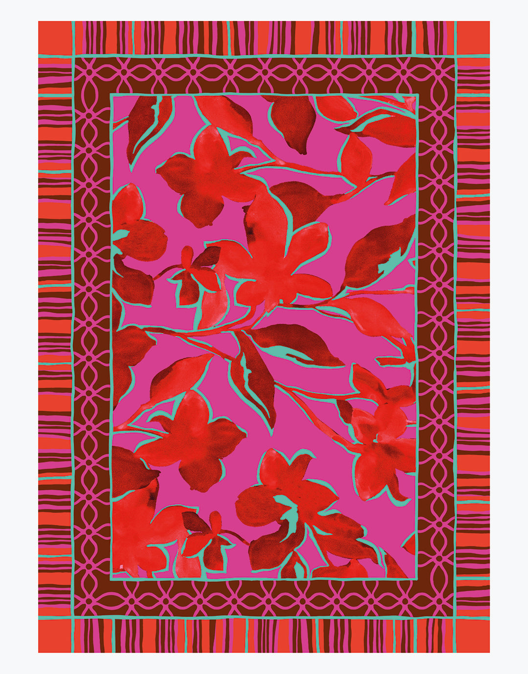 The Fused Florals pareo from Lidea is a beautiful sarong with a bold floral print in shades of fuchsia pink, red and mint green and a double border framing the design.