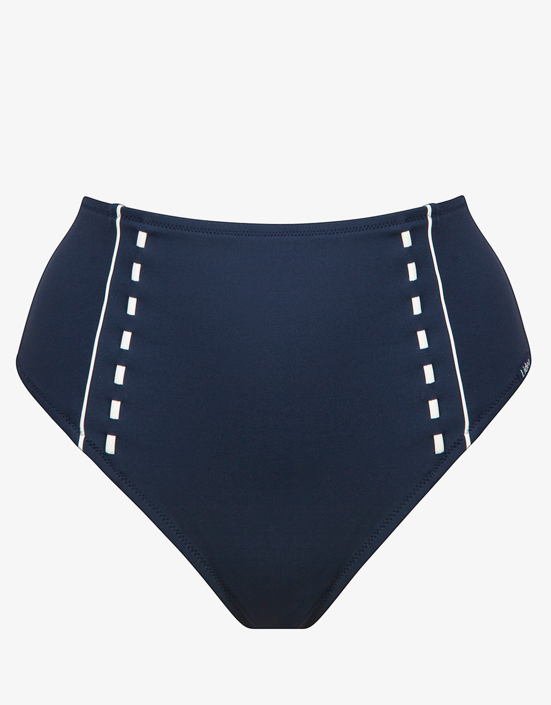 The Marine Mindset High Waist Bikini Pant from Lidea offers a retro nautical look with its deep marine blue and contrasting white piping with woven through, white pick stitching.