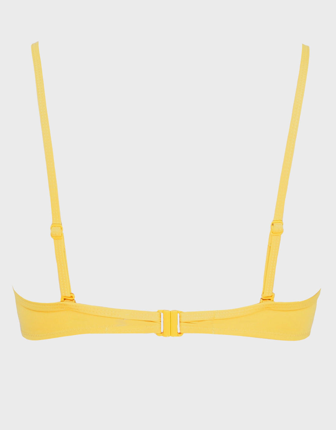The Summer Dive Underwired bikini top from Lidea is a gorgeous bright yellow underwired bikini top with structured cups and a decorative tie at the centre finished with pretty button detailing.