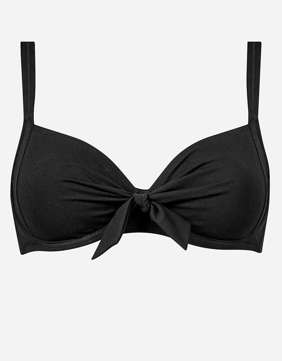 The Core Underwired bikini top in black from Lidea's Core range has a lovely little bow tied at the centre, and  bikini top with underwired moulded cups, adjustable straps and a clip at the back.