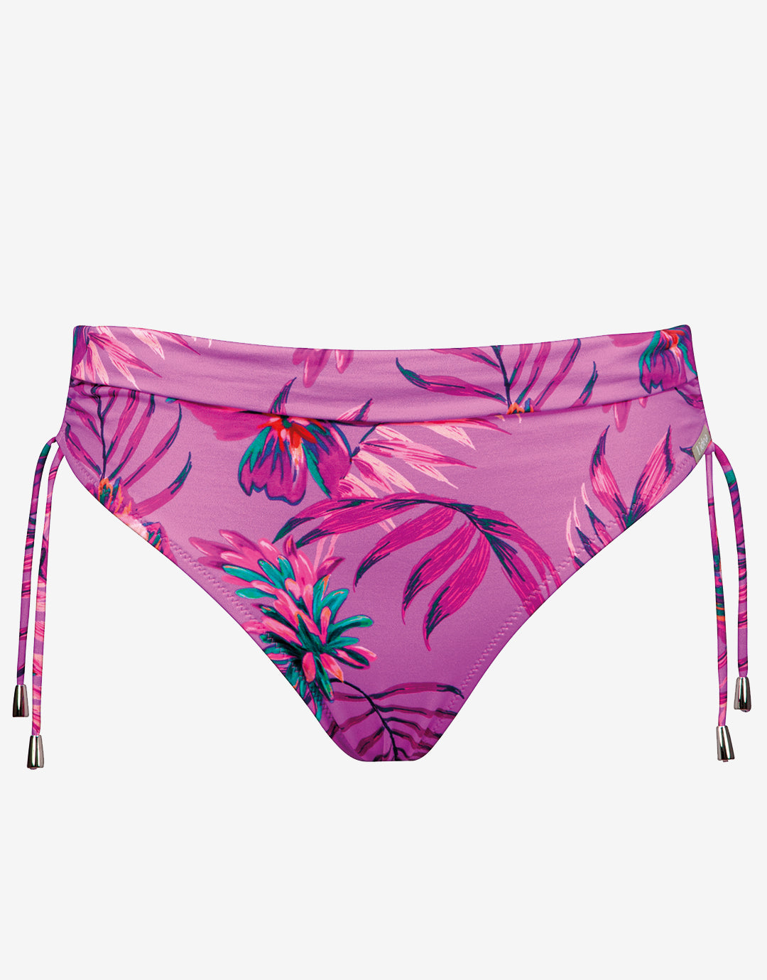 The Tropic Radiance Adjustable bikini pant from Lidea is a vibrant, pink tropical print with splashes of green and cantaloupe. This tie side style allows you to adjust leg height, has a folded waistband and offers moderate coverage.