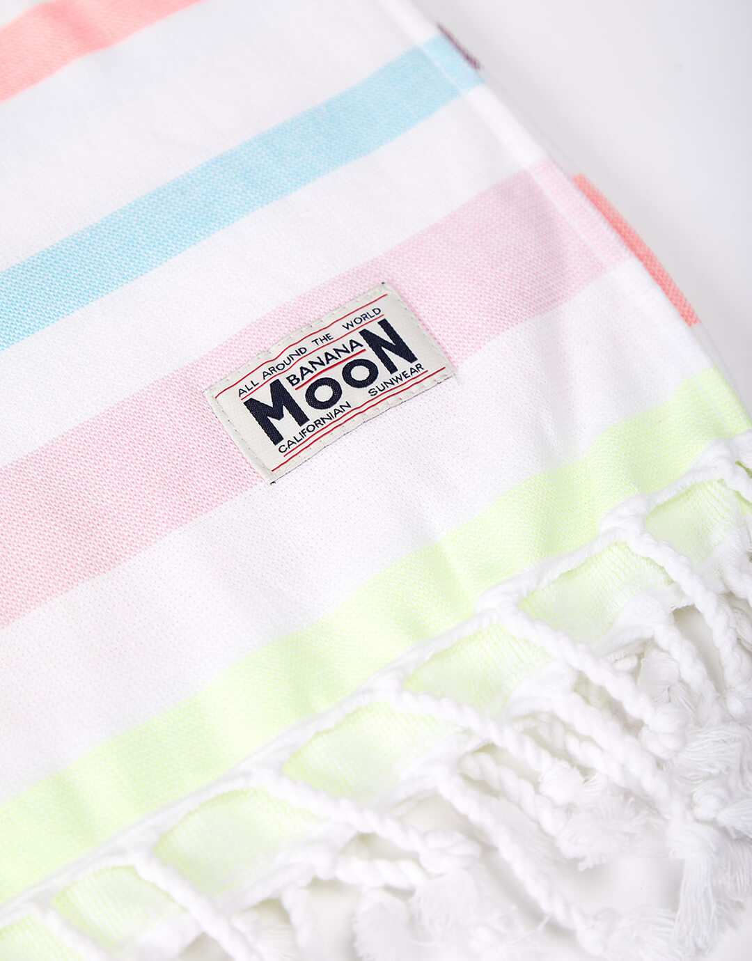 The Marbella Patsy towel from Banana is a soft pastel striped Hammam-style cotton towel with tasselled edging.