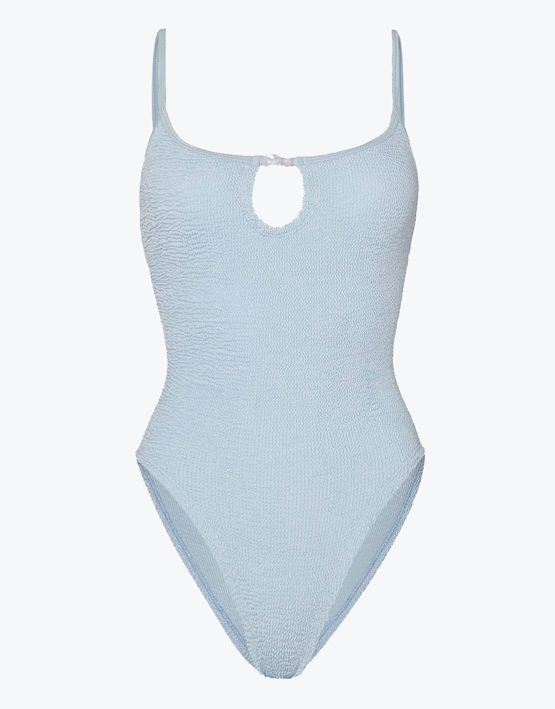 The Mia Beaded swimsuit from Hunza G in pastel blue with an icy, metallic lustre, is a scoop neck style with thin straps and a peephole cutaway over the cups with pretty bead detail, for fans of the Pamela. Constructed in Hunza’s smart Crinkle fabric which is designed to flex and sculpt to your body meaning that one size will fit sizes UK 6 to 16. With a low cut back and a high leg offering minimal rear coverage.
