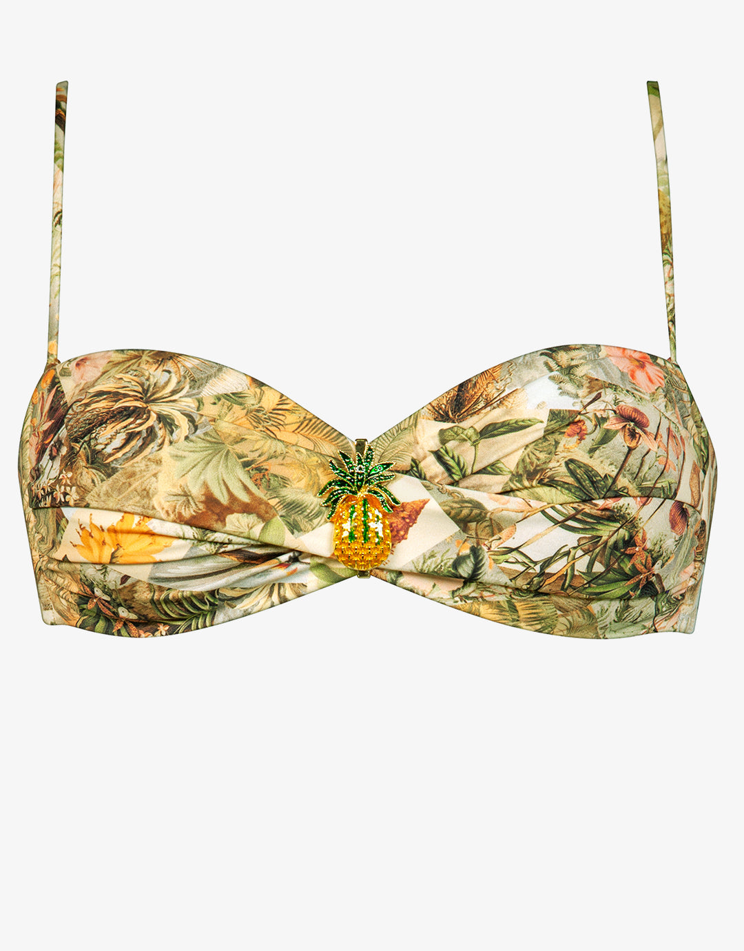 The Lush Utopia Twist Bandeau bikini top from Watercult in a muted, vintage botanical print has a beautiful twist design complemented by a pineapple embellishment (non removeable) between the cups. Optional straps and removable padded cups provides customisable support and fit.