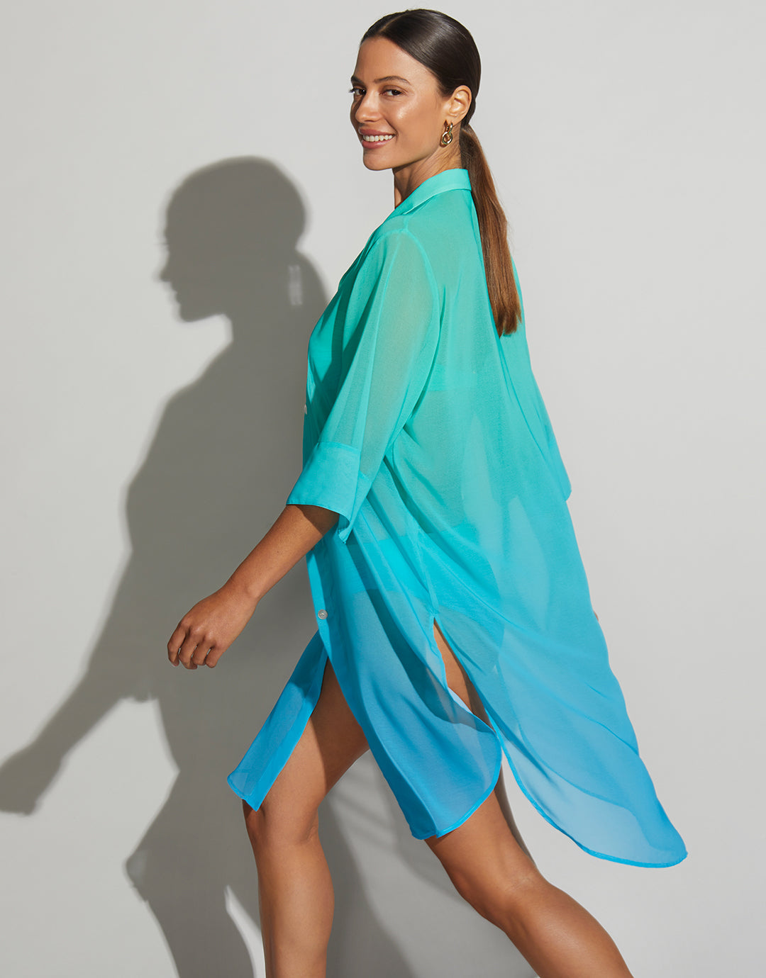The Brasil Mini Beach shirt from Roidal in a lovely turquoise and blue ombre style is a knee-length shirt with a collar, loose three-quarter length sleeves with open cuffs and a button through front.