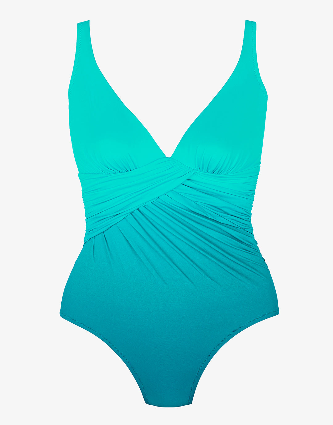 The Brasil Twist Front Gathered swimsuit from Roidal in this beautiful green and blue ombre print has a lovely twist front which creates flattering ruching around the centre and a plunging neckline. With adjustable straps, a medium legline and moderate rear coverage.
