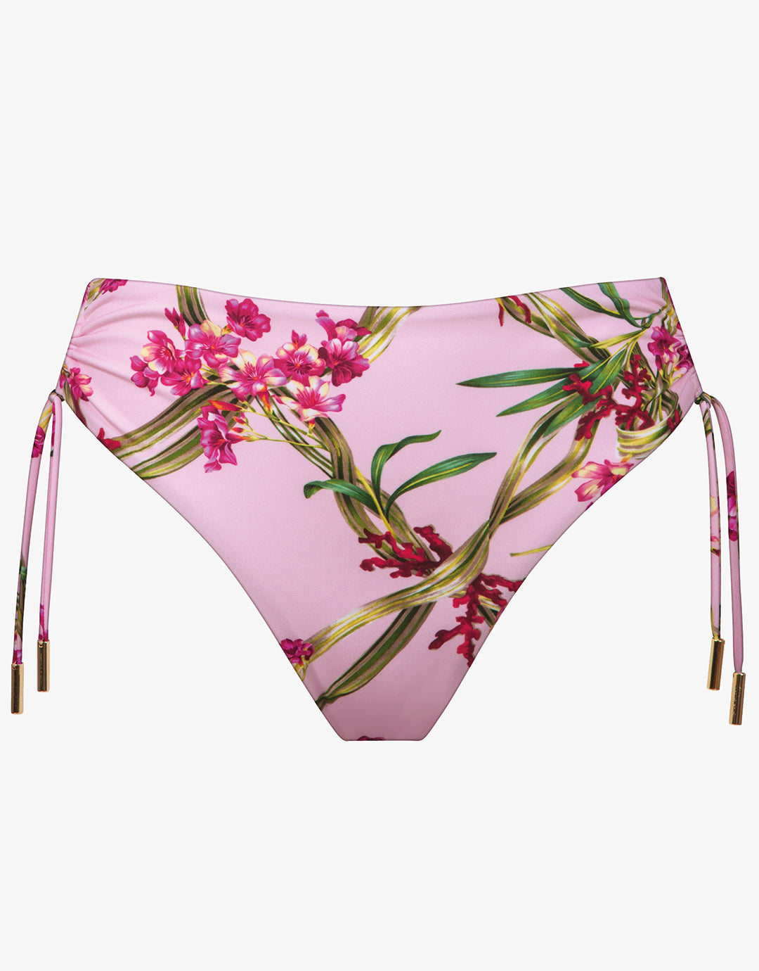The Botanique Adjustable bikini pant from Maryan Mehlhorn in a beautifully feminine pink botanical print is a full coverage style with wide sides which can be adjusted to raise or lower the leg height.