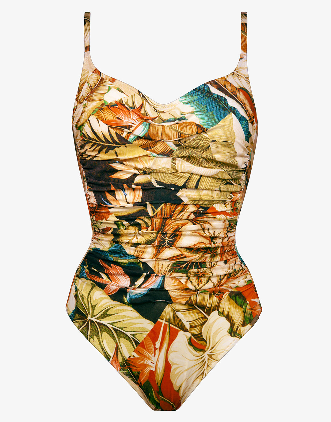 The Hypnotic Ruched Underwired swimsuit from Maryan Mehlhorn is a stunning, tropical leaf print swimsuit in the popular underwired and ruched tummy style. With a shaped neckline, ruched front, underwired cups and adjustable straps.