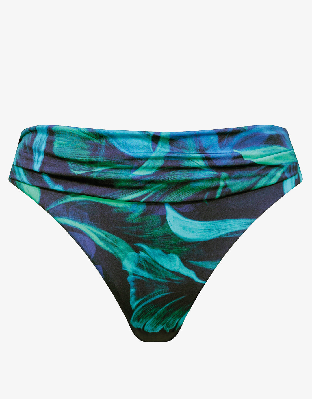The Sanctuary Banded bikini pant from Maryan Mehlhorn in a beautiful tropical aquatic print of greens and blues, is a full-coverage bikini pant with gathering at the waistband.