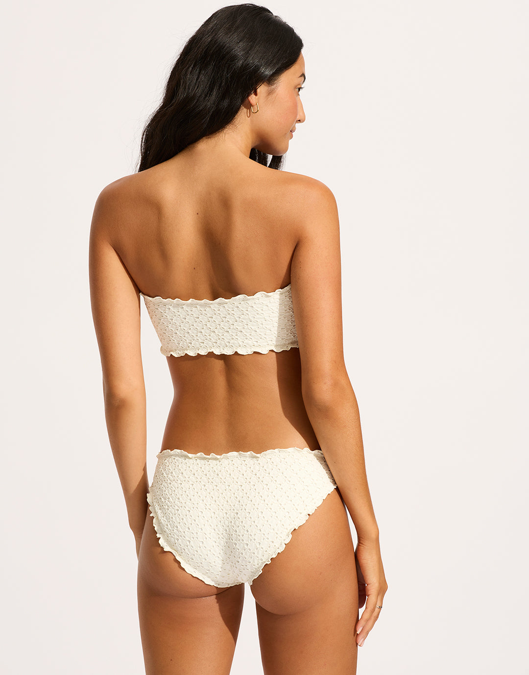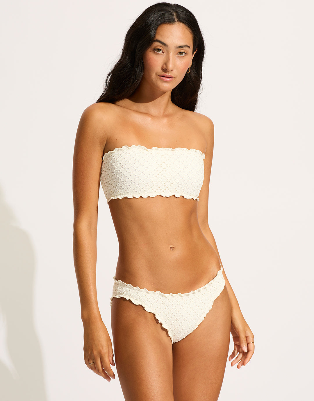 The Daydreamer Tube bikini top from Seafolly in this lovely Vanilla cream broderie knit fabric is a strapless bandeau tube style with an optional removable strap, removable cups and delicate lettuce edging.