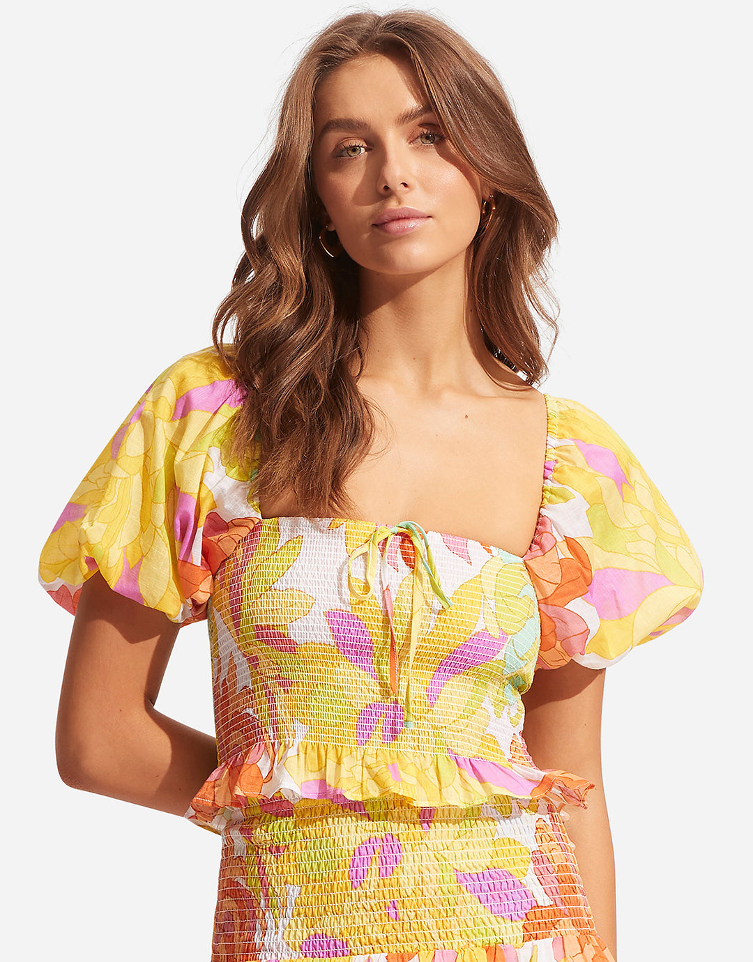 The Palm Springs Shirring top from Seafolly is a pretty peasant-style top with elasticated shirred bodice, a square neckline and short balloon sleeves.
