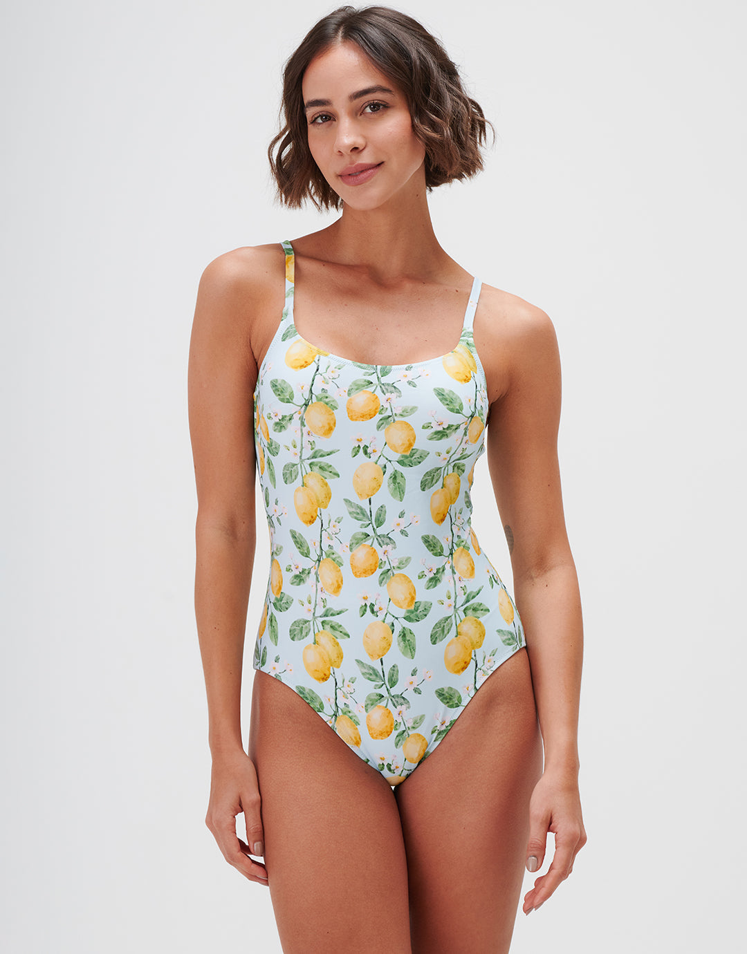 The Fior Di Limone Tank swimsuit from Jo Severin captures the essence of a sun-drenched Italian summer, with soft lemons, green leaves and delicate blossoms set against a pale sky blue background. This clean, elegant style features a gently rounded tank neckline, a flattering U-shaped back, and narrow adjustable straps for a comfortable, secure fit. Sewn-in padded cups and light tummy support provide a smooth, flattering silhouette.
