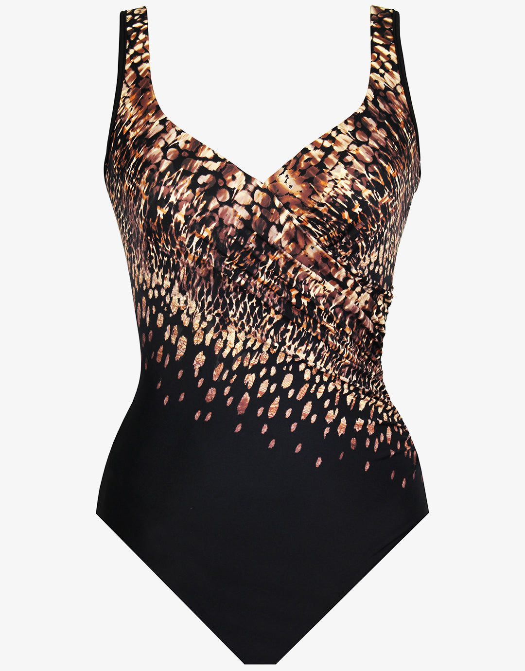 The Dali Leopard It's a Wrap swimsuit from Miraclesuit has a lovely animal inspired print across the top half of this swimsuit style in an asymmetrical design. This comfortable style has a wrap at the front, underwired foam cups and comfortable padded straps.