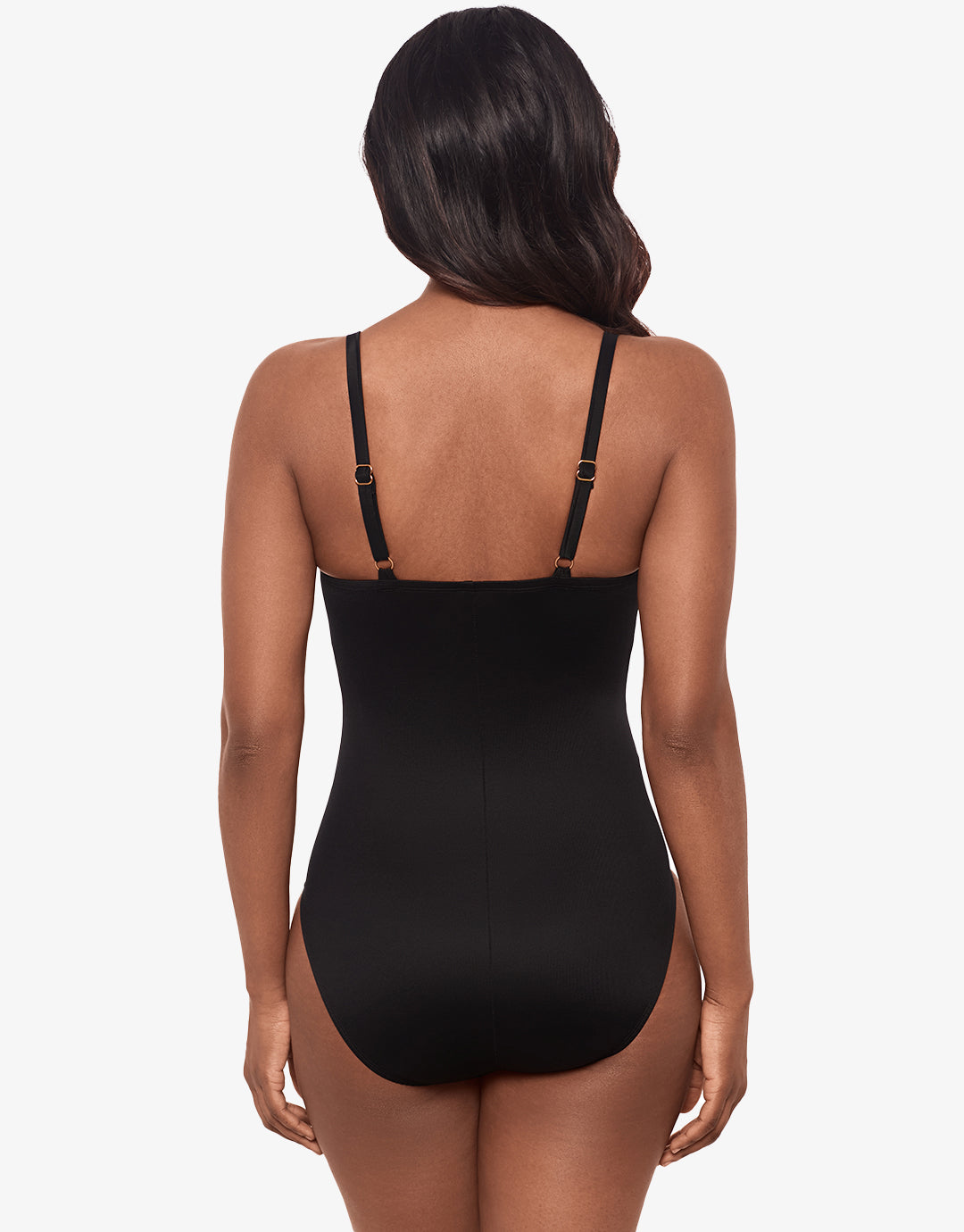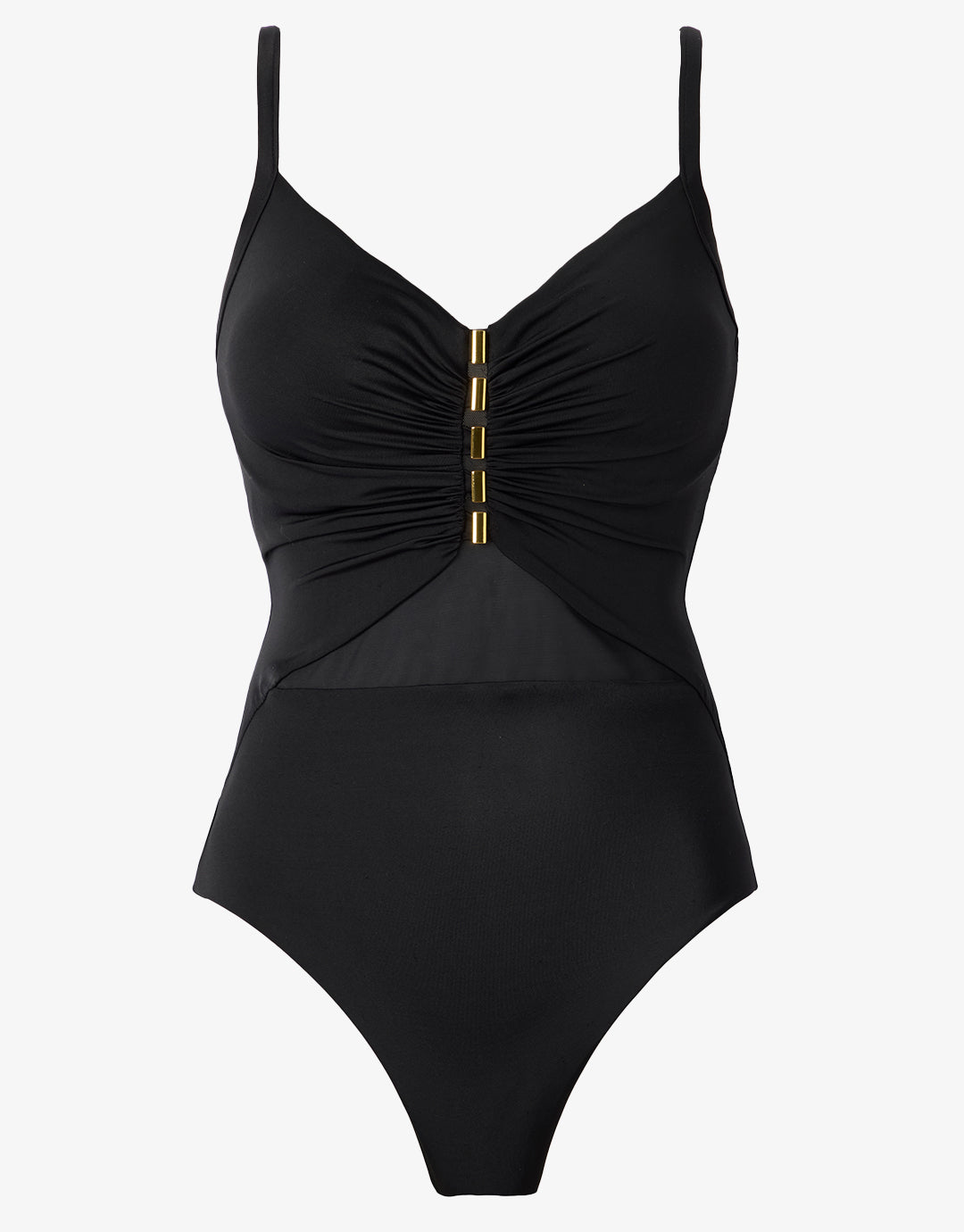 The Network News Mariposa swimsuit from Miraclesuit is a stunning v neck style with gathering over the bust, mesh inset and metallic gold detailing at the centre that creates a flattering hourglass waist effect. This style is underwired and has thin, adjustable straps.