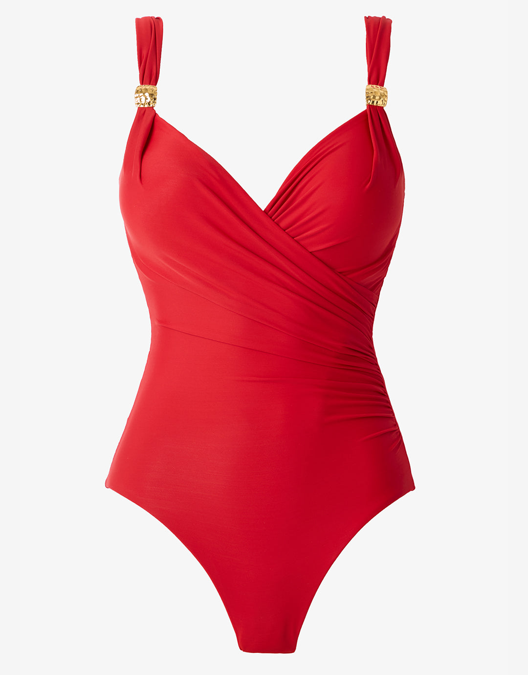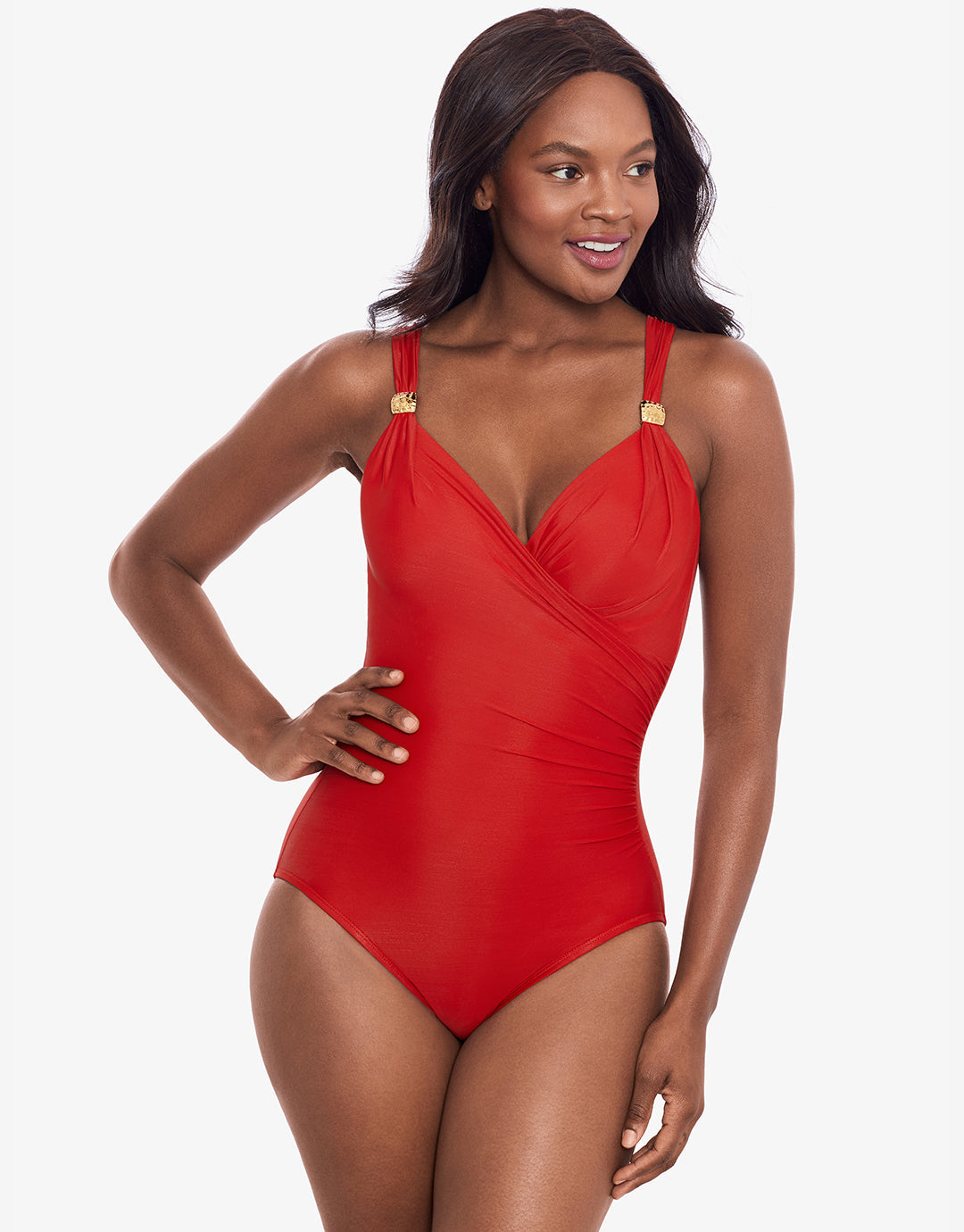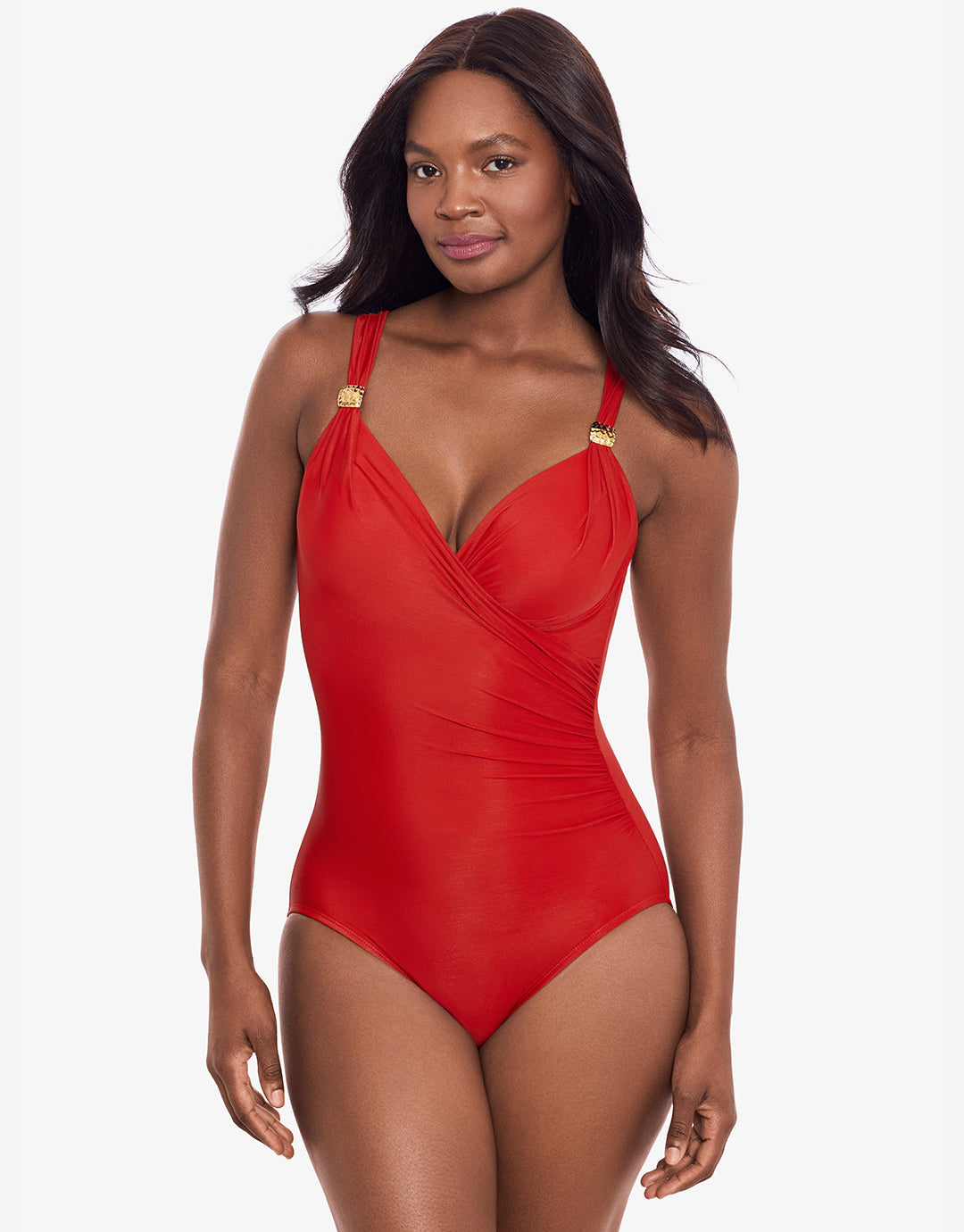 The Siren swimsuit from Miraclesuit is a lovely plunging neckline style with moulded, underwired cups and adjustable straps which are wide at the front and gathered at the apex with co-ordinating metallic detailing. This Razzle Dazzle style is a stunning warm Cayenne red colour with metallic gold ring detailing.