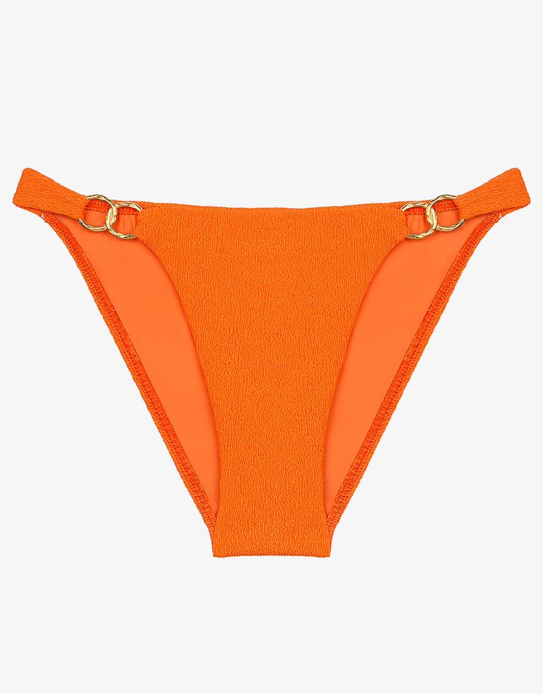 The Firenze Jolie Detail Full bikini pant from ViX in stunning Marigold orange textured fabric is a full pant offering moderate rear coverage. Featuring gold metallic ring details on the hips and ViX metallic logo on the back.