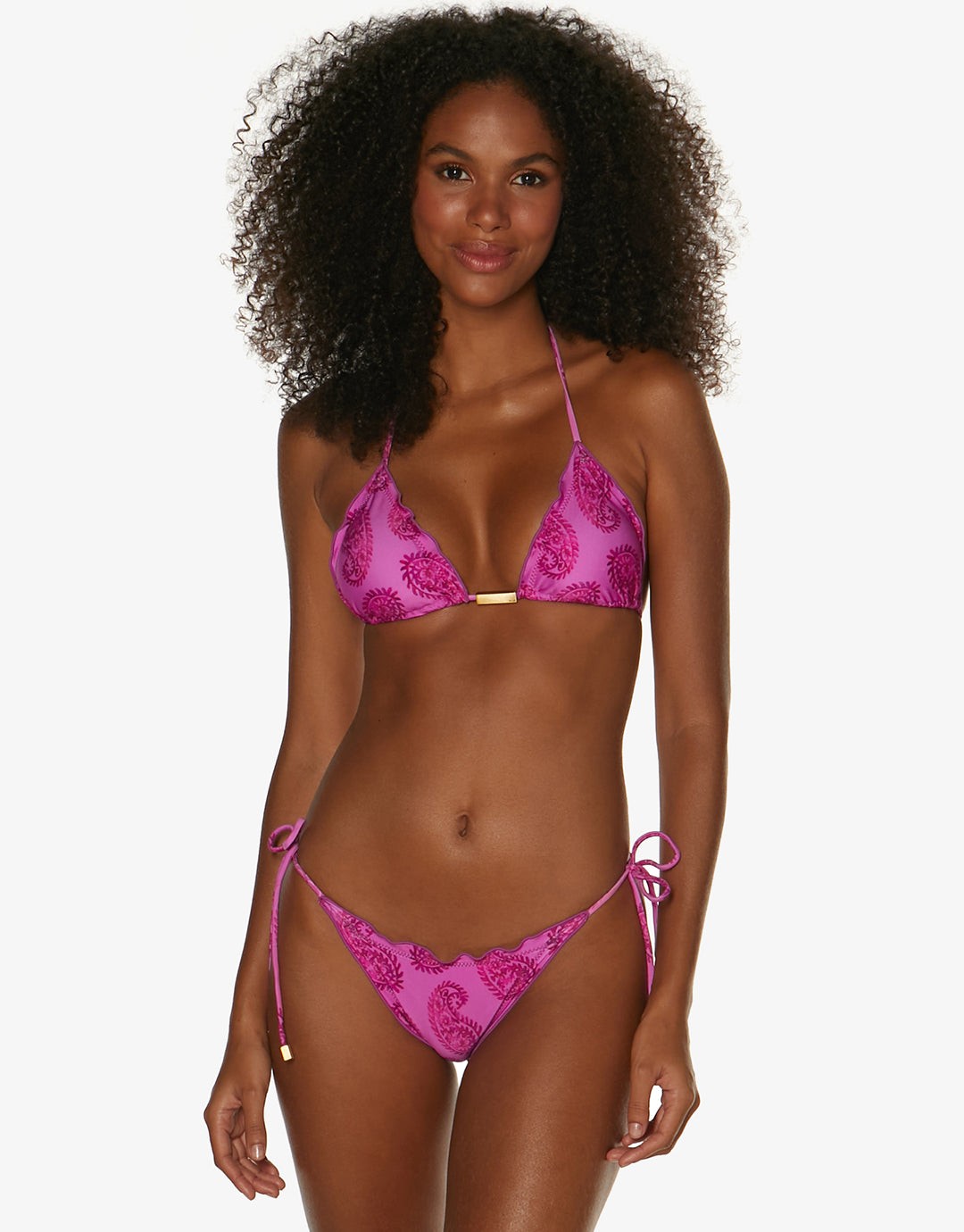 The Leela Ripple Tie bikini pant from ViX is a gorgeous pink print pant with ties at the sides, fluted edging and finished with gold coated end caps.